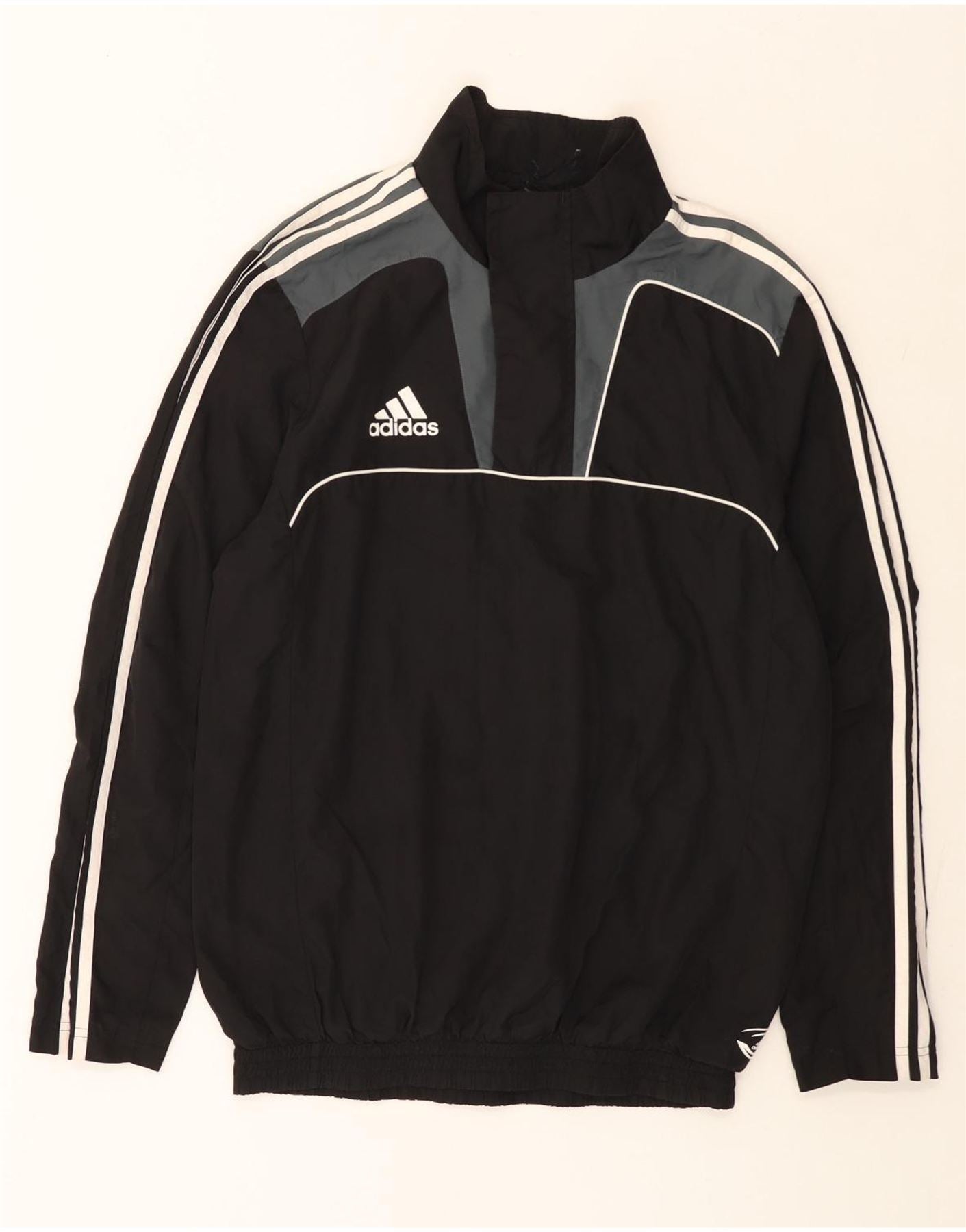 - Descriere AI: Această jachetă de vânt pentru bărbați Adidas este confecționată din țesătură ușoară din poliester negru. Are un gât înalt și o închidere practică cu fermoar 1/4. Designul colorblock include panouri gri și dungi albe pe mânecile lungi. Un logo subtil Adidas adaugă detalii ale mărcii. Această jachetă cu potrivire obișnuită include buzunare pentru funcționalitate, oferind un stil confortabil și sportiv.