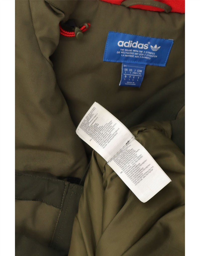- AI Description: This Adidas men's Parka Jacket is crafted from durable khaki polyester, featuring a woven and padded construction for warmth. It boasts a regular fit and long sleeves, ensuring comfort and coverage. The hooded design offers extra protection, while the full zip closure provides practicality. Zipped pockets add secure storage and a functional accent. This modern jacket is ideal for sports and everyday wear.