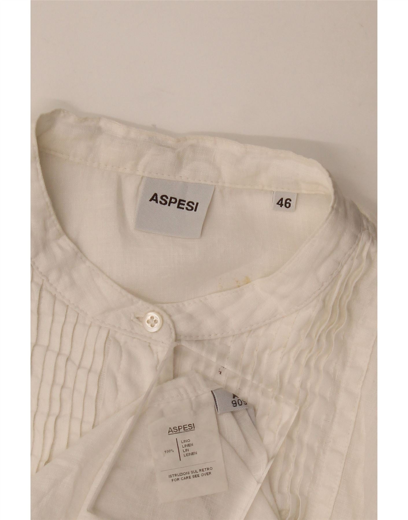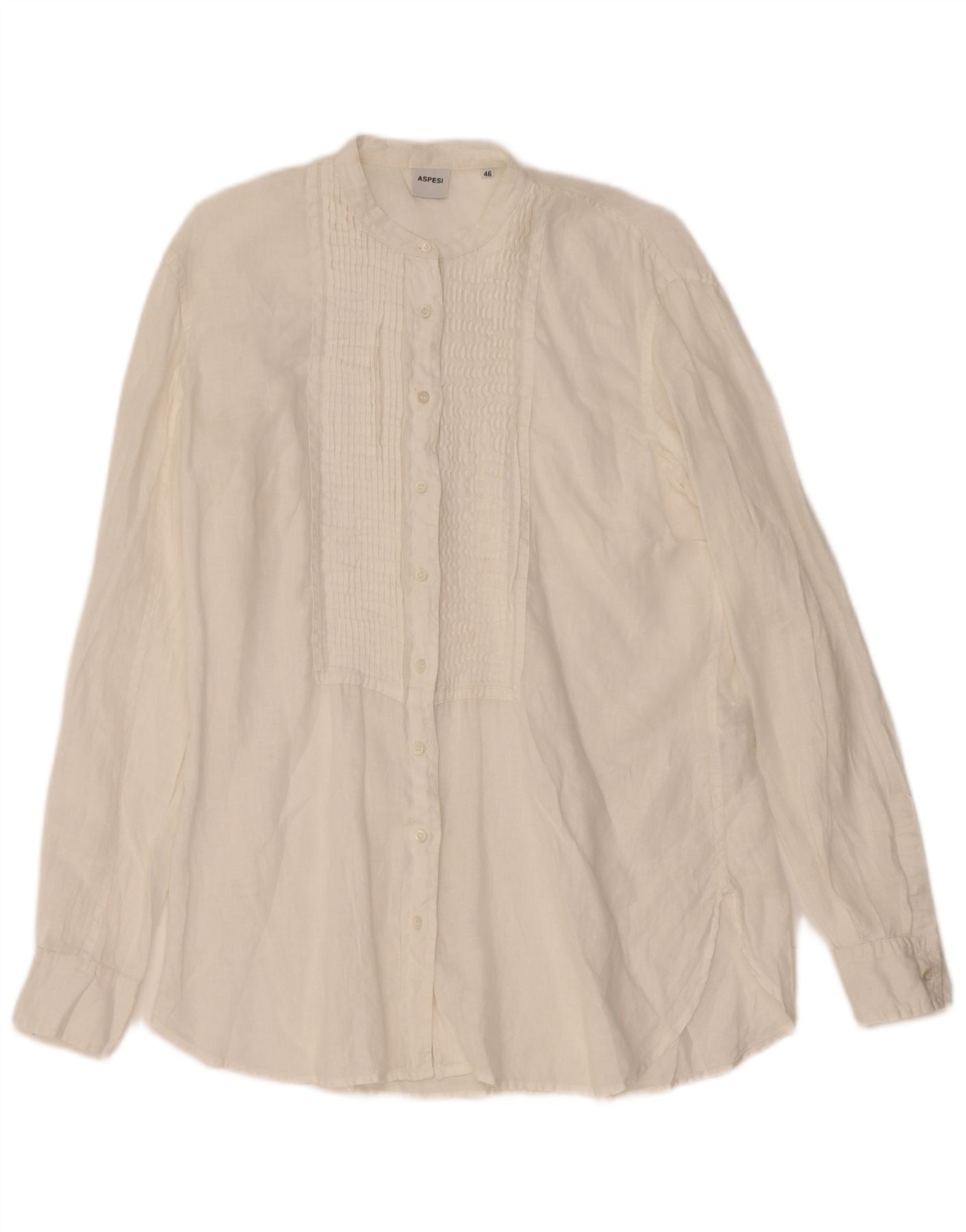 - Descriere AI: Acest top de bluză pentru femei Aspesi este confecţionat 100% din lenjerie albă. Are un decolteu cu guler cu bandă și mâneci lungi. Fața este detaliată cu pliuri elegante și o închidere completă cu nasturi. O potrivire regulata asigura o purtare confortabila si o silueta clasica. Această piesă oferă o estetică rafinată, dar relaxată, perfectă pentru stilul versatil.
