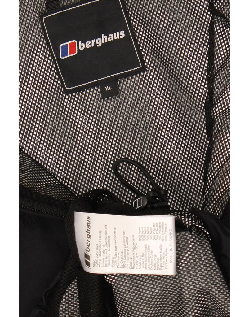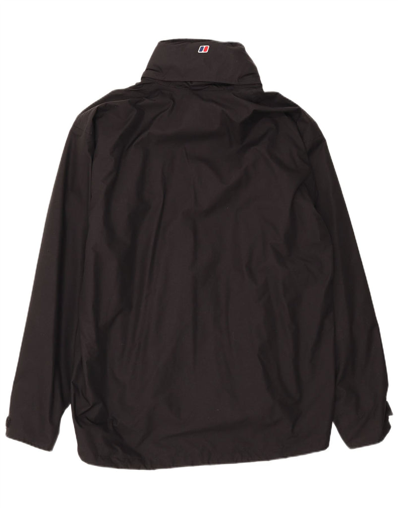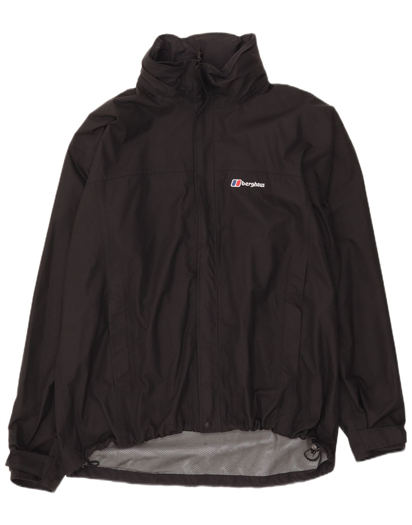 - AI Description: This Berghaus mens waterproof jacket is crafted from durable black nylon with a polyurethane coating, offering a smooth, protective finish. It features a high neck and a full zip closure for secure coverage. Long sleeves and a regular fit ensure comfortable wear. The integrated hood provides extra protection. Zipped pockets offer practical storage. A subtle logo accent completes the design, making it ideal for outdoor pursuits.