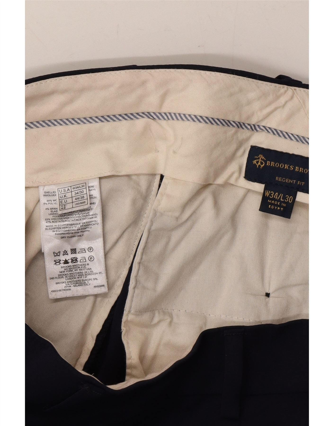 - AI Description: These Brooks Brothers mens suit trousers are crafted from a refined navy blue blended fabric. The material combines polyester, wool, and spandex for a comfortable stretch and a smooth, tailored finish. They feature a classic button and zip closure for a secure fit. The Regent Fit offers a regular, sophisticated silhouette. Practical pockets complete this timeless, professional design.