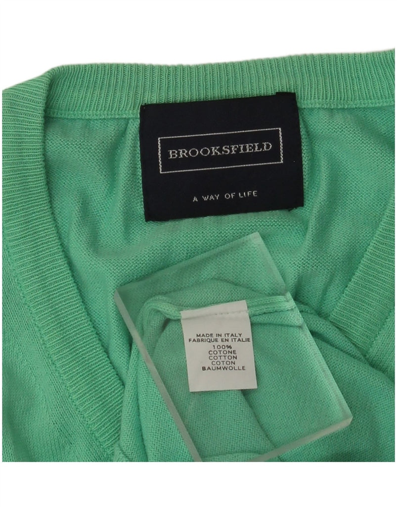 - AI Description: This Brooksfield mens knit vest is crafted from 100 percent cotton, offering a soft, breathable texture. Its classic V-neckline and sleeveless design provide a versatile, comfortable fit. The pullover style ensures easy wear. A regular fit maintains a smart silhouette. A subtle logo detail adds a refined brand touch to this timeless green garment.