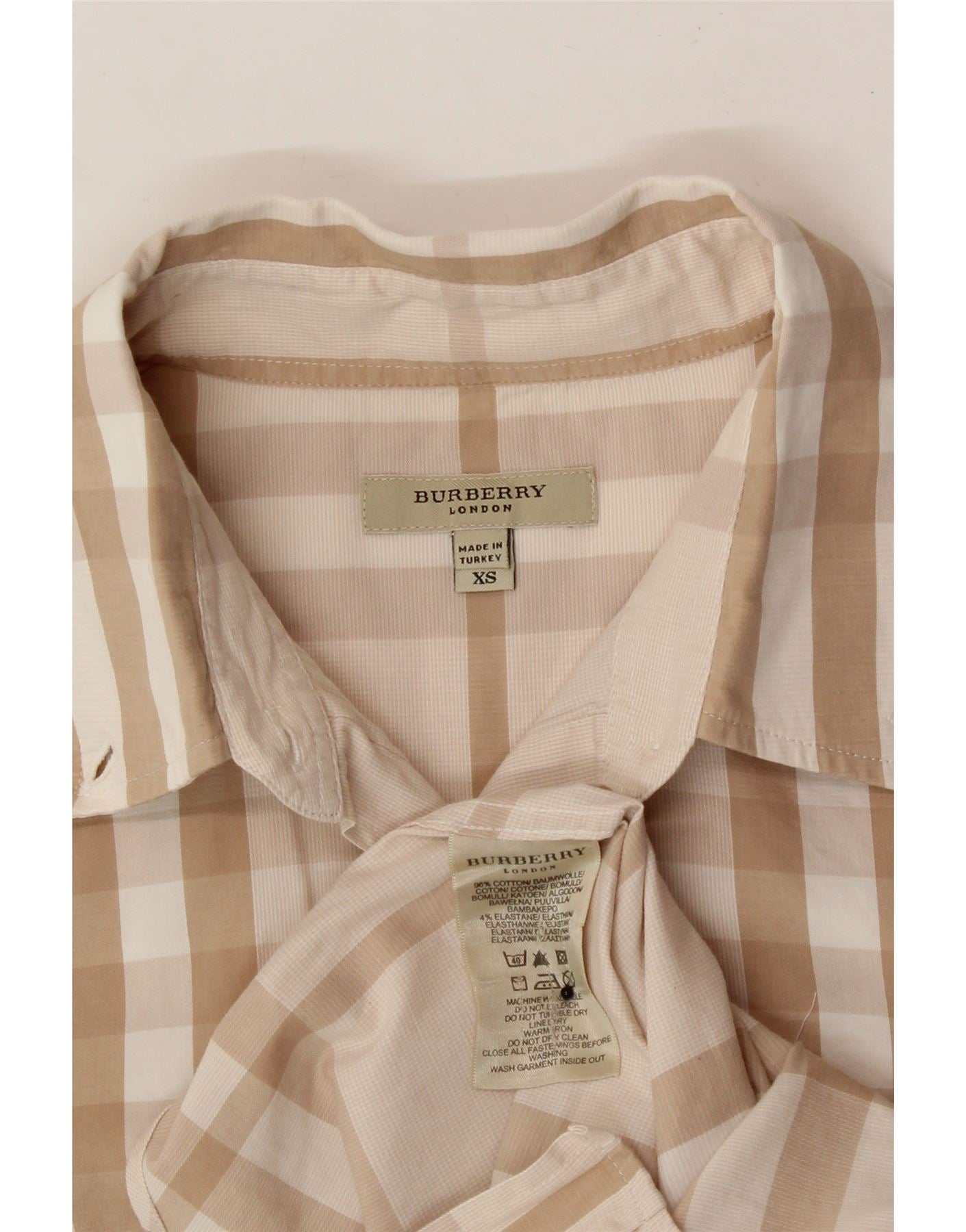- AI Description: This pre-owned Burberry shirt blouse is a classic addition to any wardrobe. Crafted in Turkey from a comfortable blend of 96% cotton ramie and 4% elastane, this beige, short-sleeved blouse features a check pattern, collared neckline, and button closure. The regular fit design includes practical pockets. While in excellent condition, there are minor loose stitches on the buttons and collar. Label size XS. Machine washable for easy care.