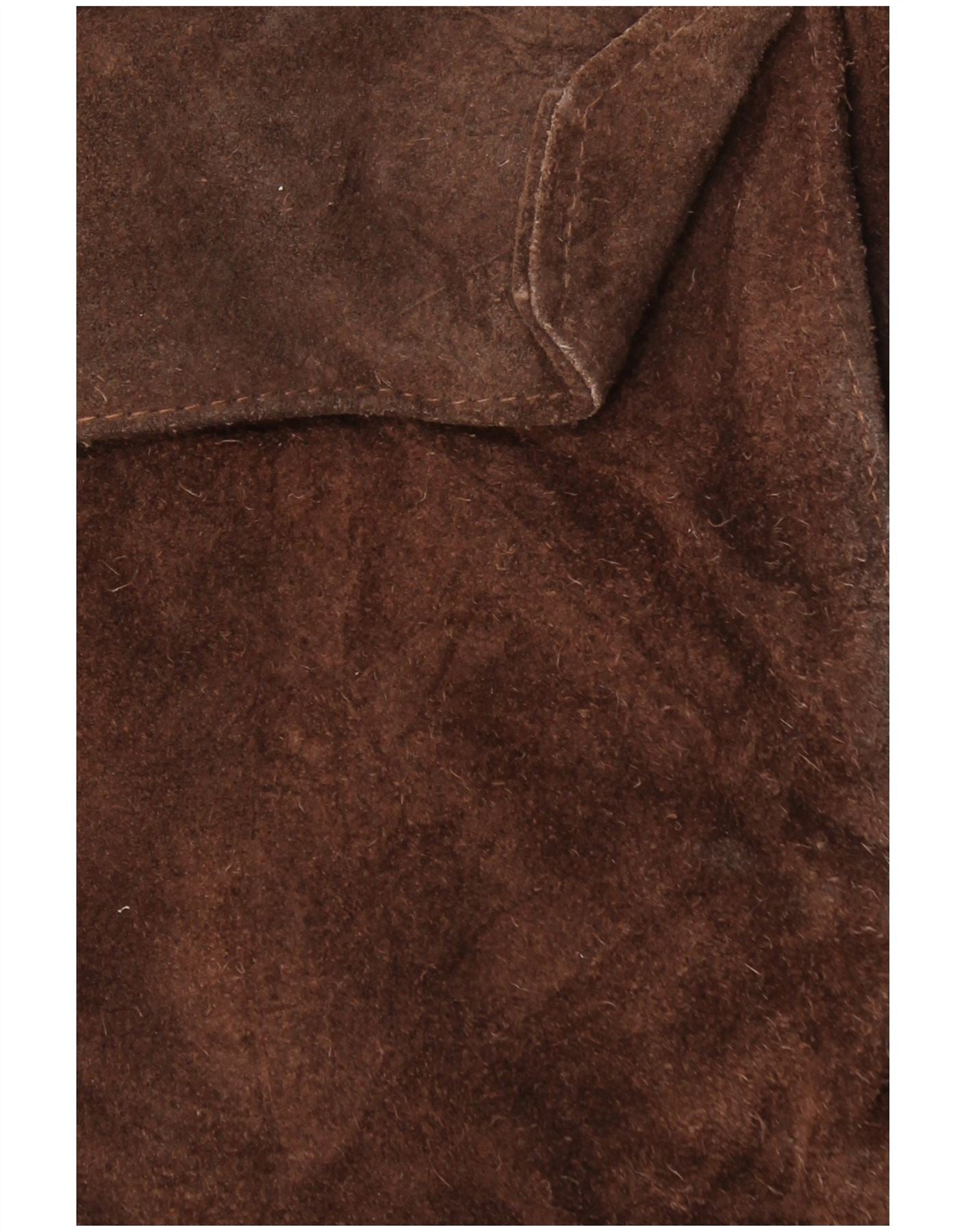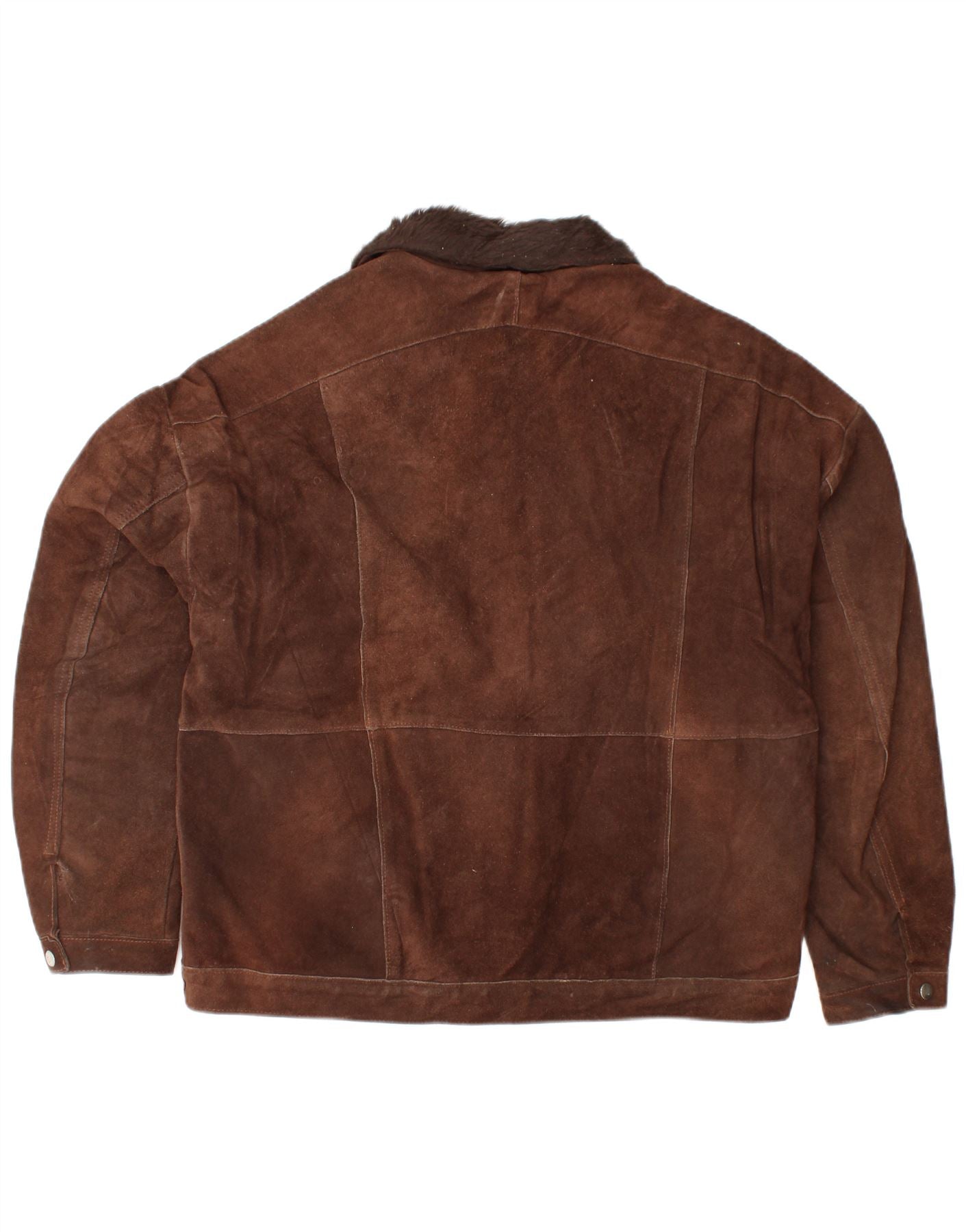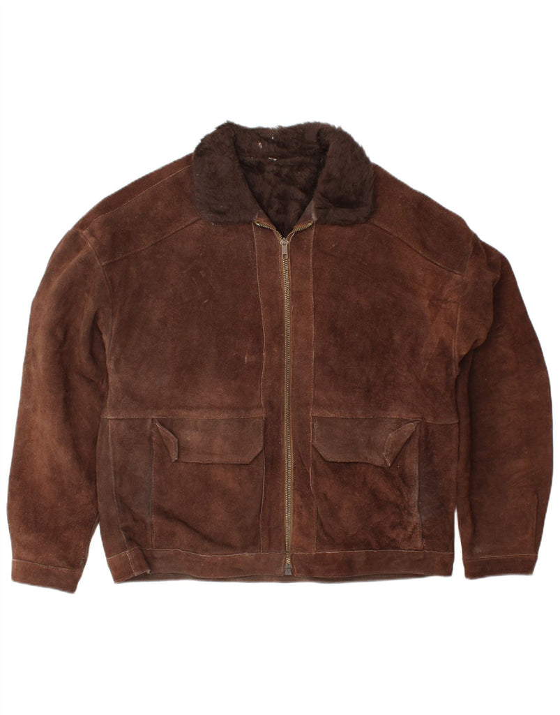 - AI Description: This C&A mens suede jacket is crafted from rich brown suede, offering a luxurious texture. It features a classic collared neckline and long sleeves. A full zip closure provides a secure fit. The interior boasts a warm shearling lining and fur trim for added comfort and style. Practical pockets are included. Its regular fit ensures comfortable wear.