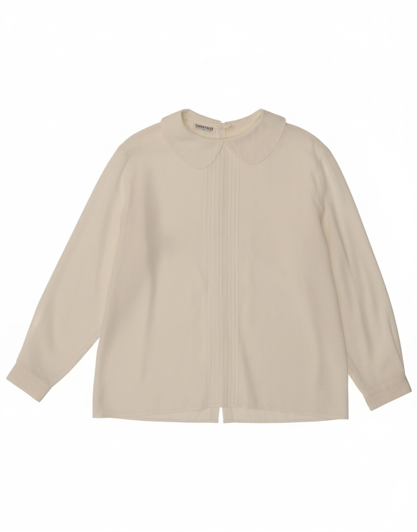 - AI Description: This Cacharel womens blouse top is presented in a sophisticated off white woven fabric. It features a classic collared neckline and long sleeves. The regular fit ensures comfortable wear. Button closures offer a neat finish. Subtle pleated accents add a refined touch to this elegant design.