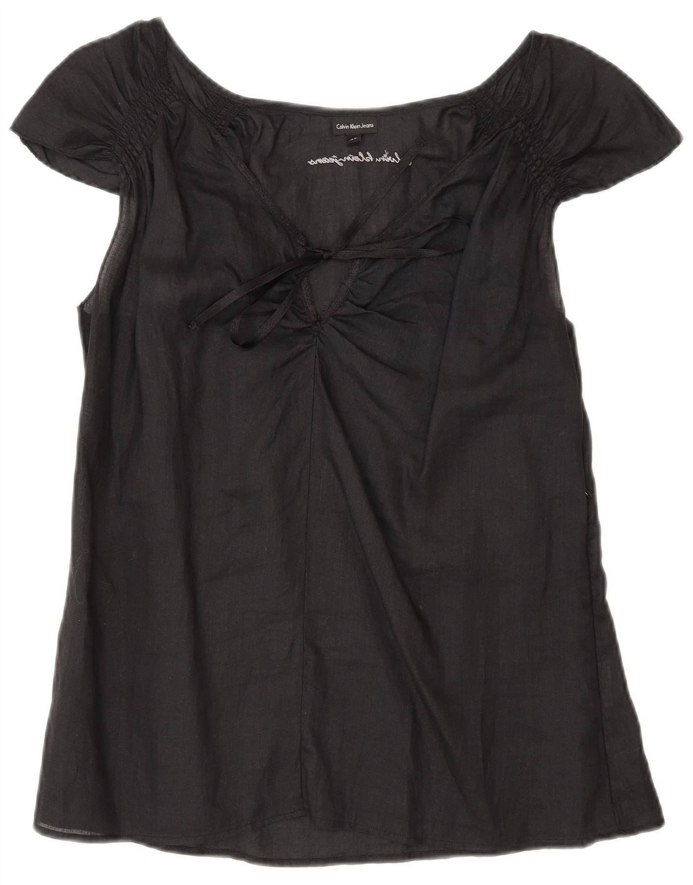 - Descriere AI: Acest top de bluză pentru femei Calvin Klein Jeans este confecționat dintr-o țesătură neagră ușoară. Are un decolteu rotund și mâneci scurte, fluturante. Un detaliu distinctiv de cravată în față creează o fundă subtilă la decolteu. Potrivirea relaxată asigură o purtare confortabilă. Acest stil de pulover oferă o eleganță fără efort, perfect pentru stilul versatil.