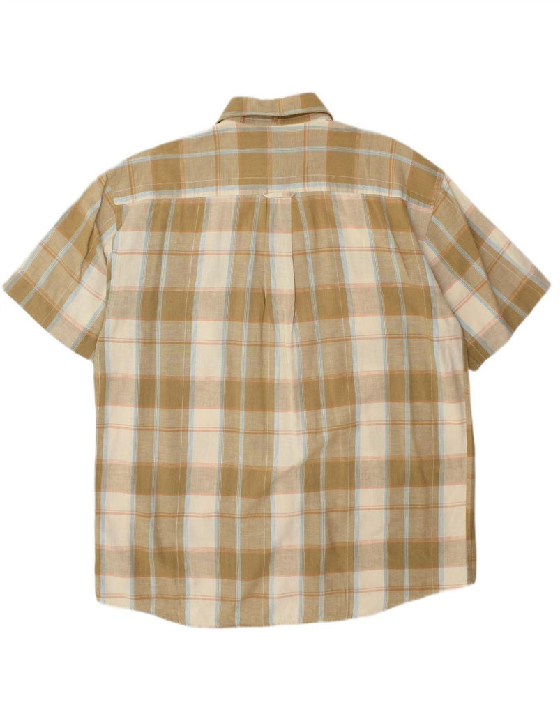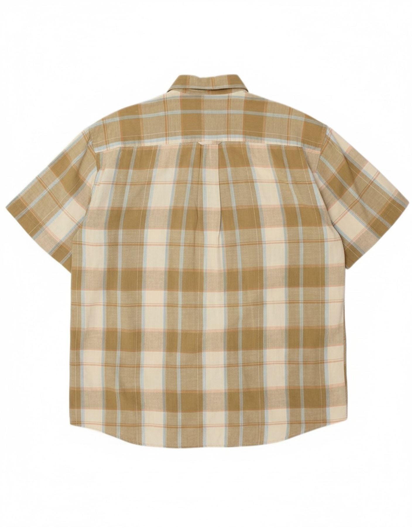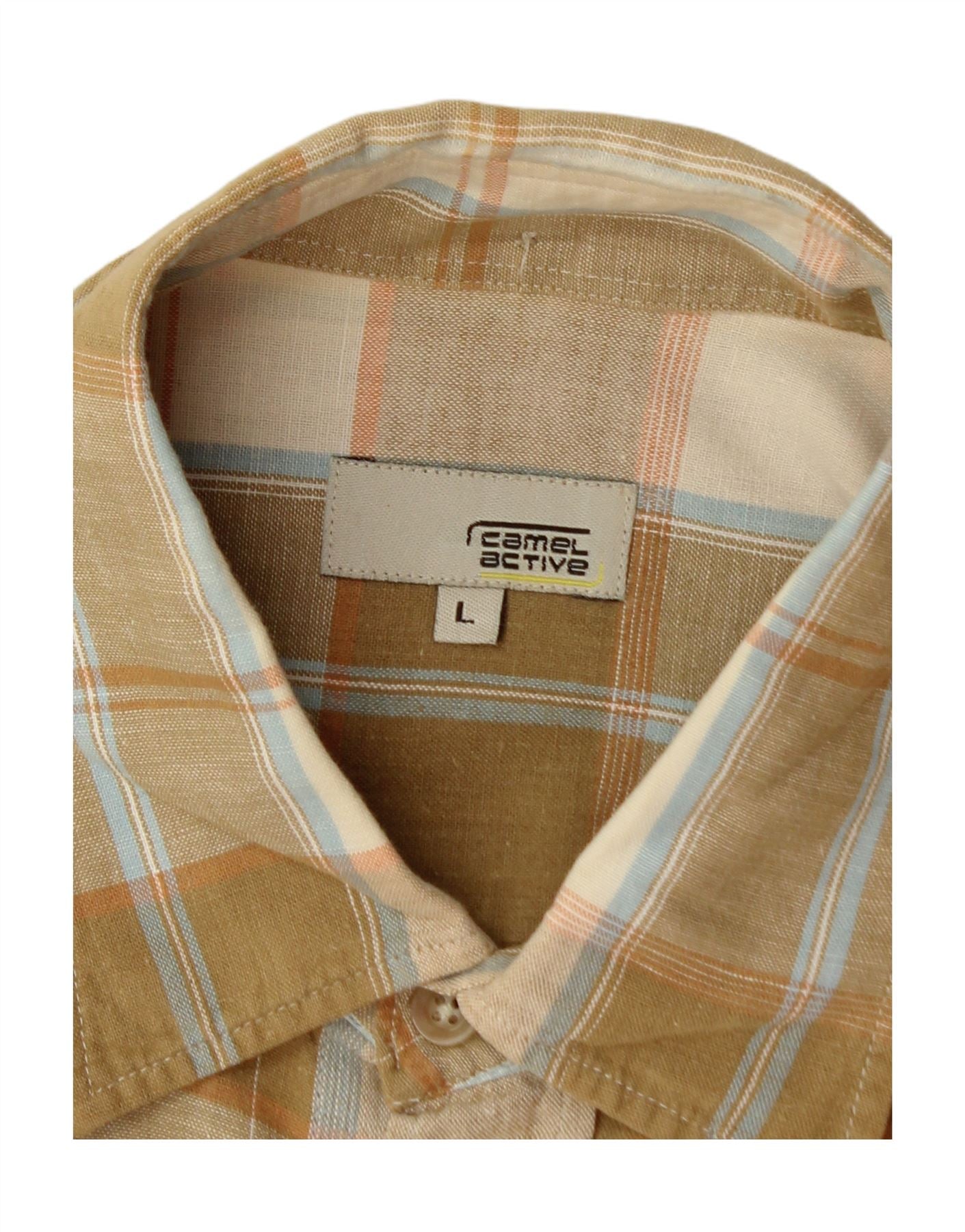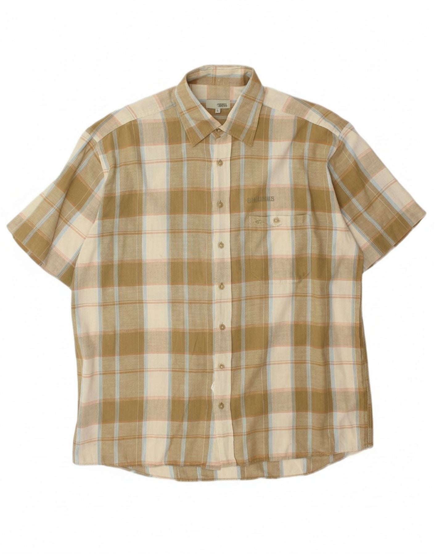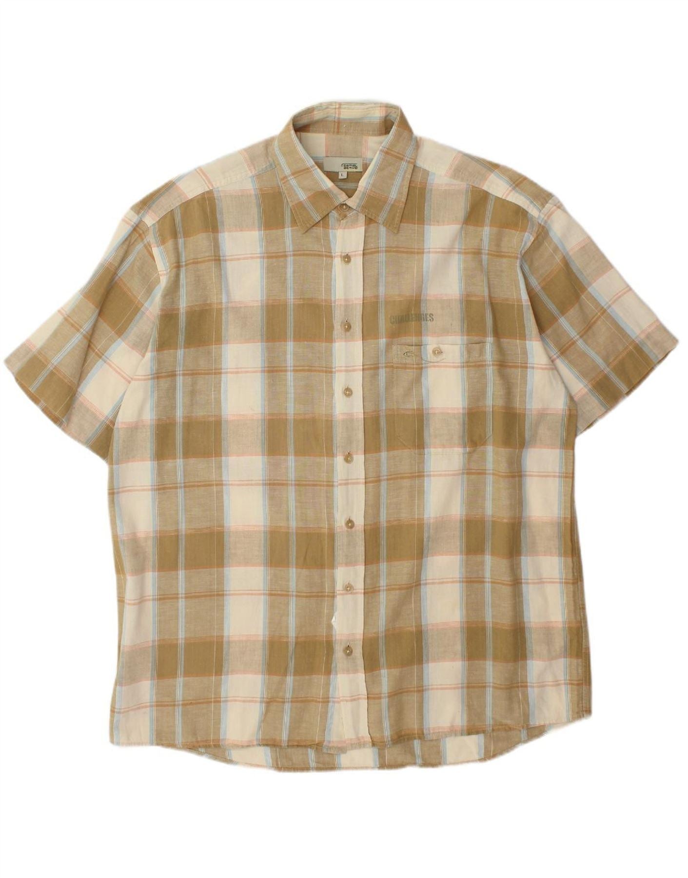 - AI Description: This Camel Active men's short sleeve shirt features a smart beige plaid pattern woven into comfortable fabric. The collared neckline and full button-up front give it a classic, versatile appeal. Short sleeves and a regular fit ensure easy wear and a relaxed silhouette. A chest pocket adds practical detail, while a subtle logo provides signature branding. This shirt offers refined casual style.