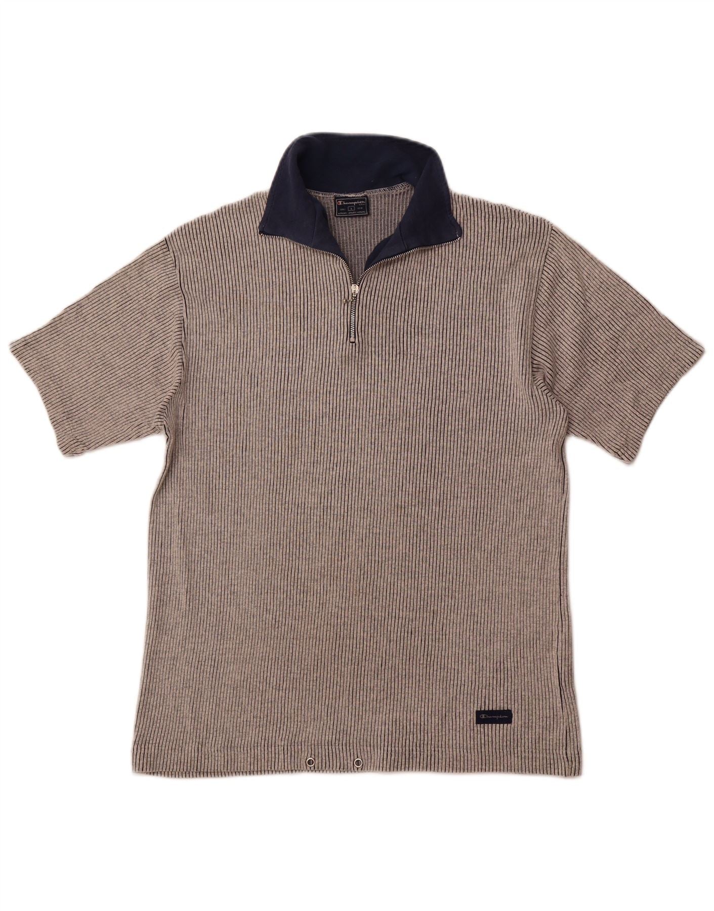Home > Îmbrăcăminte Vintage Champion > a bărbaţilor > Tricouri > Tricou pentru bărbați CHAMPION, cu fermoar, cu gât, din bumbac mare, gri cu dungi