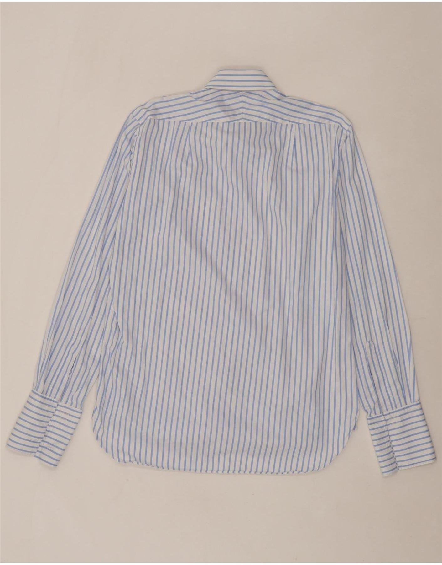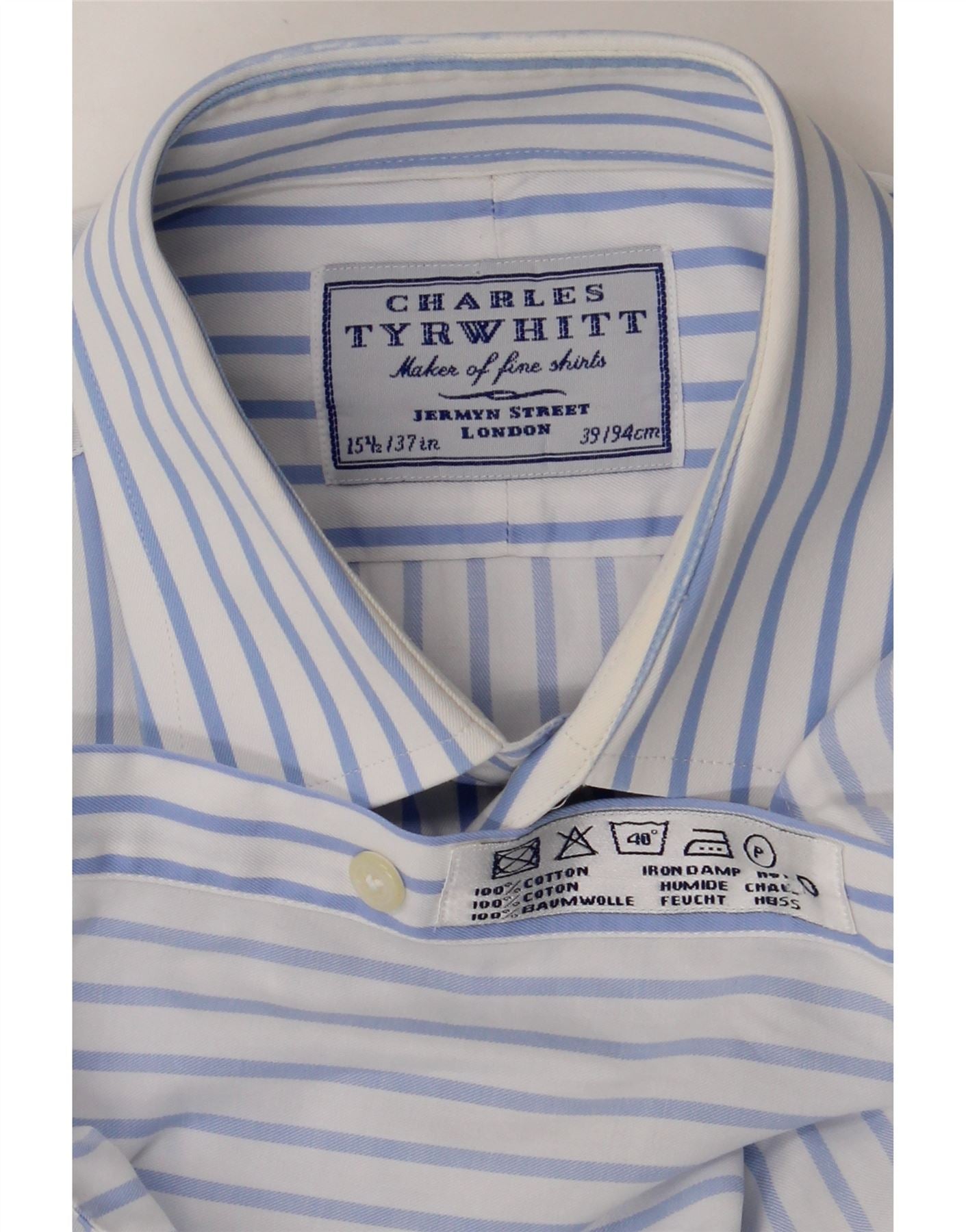 - AI Description: This pre-owned Charles Tyrwhitt shirt is in excellent condition. Crafted from 100% cotton with a woven fabric, this long-sleeved, blue striped shirt features a regular fit and collared neckline. Accented with buttons, the shirt includes pockets and cuffs. The label size is 15½/37 in. Style: Preppy. Washing instructions: Iron damp.
