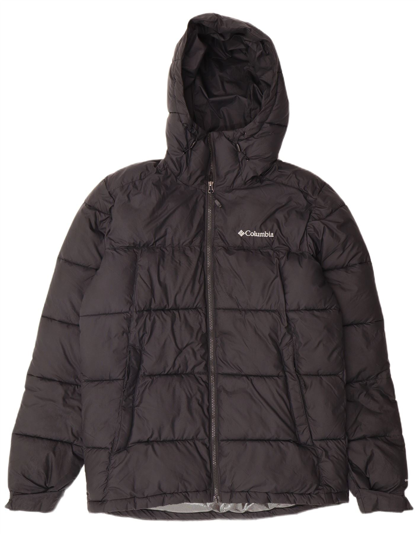 - AI Description: This Columbia mens padded jacket is crafted from durable black polyester, offering a smooth, woven finish. Its padded construction provides excellent thermal insulation. It features a high neck and a full zip closure for secure warmth. Long sleeves ensure full coverage. The regular fit allows for comfortable layering. A practical hood adds extra protection. Multiple pockets offer convenient storage. A subtle brand logo provides a signature accent.