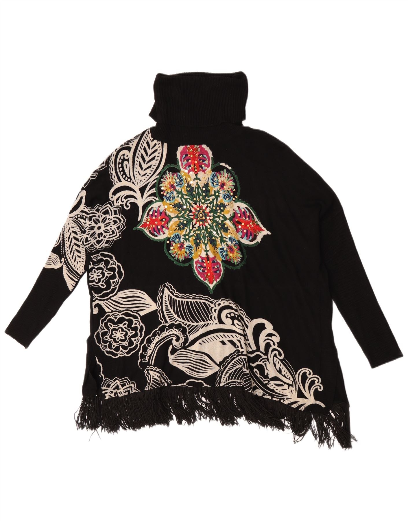 - Descriere AI: Acest pulover pentru femei Desigual cu gât rulat este realizat dintr-un amestec moale de tricot acrilic. Are o potrivire relaxată de poncho, cu un gât confortabil. Țesătura neagră prezintă un model grafic floral vibrant. Mânecile lungi se termină în manșete îngrijite. Un detaliu jucăuș de franjuri împodobește tivul, adăugând farmec boem.