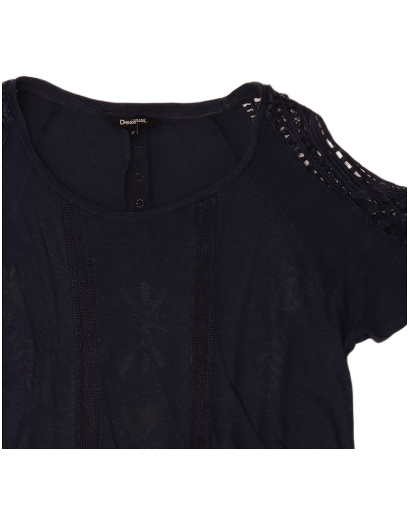 - Descriere AI: Acest tricou pentru femei Desigual este confecționat dintr-o țesătură moale de tricot albastru. Are un decolteu rotund clasic și mâneci scurte. Elementele grafice florale complicate împodobesc partea din față, adăugând interes vizual. Detaliile delicate din croșetat sporesc umerii și mânecile. Potrivirea obișnuită oferă o purtare confortabilă. Acest stil de pulover întruchipează o estetică boemă, perfectă pentru un look relaxat, dar elegant.