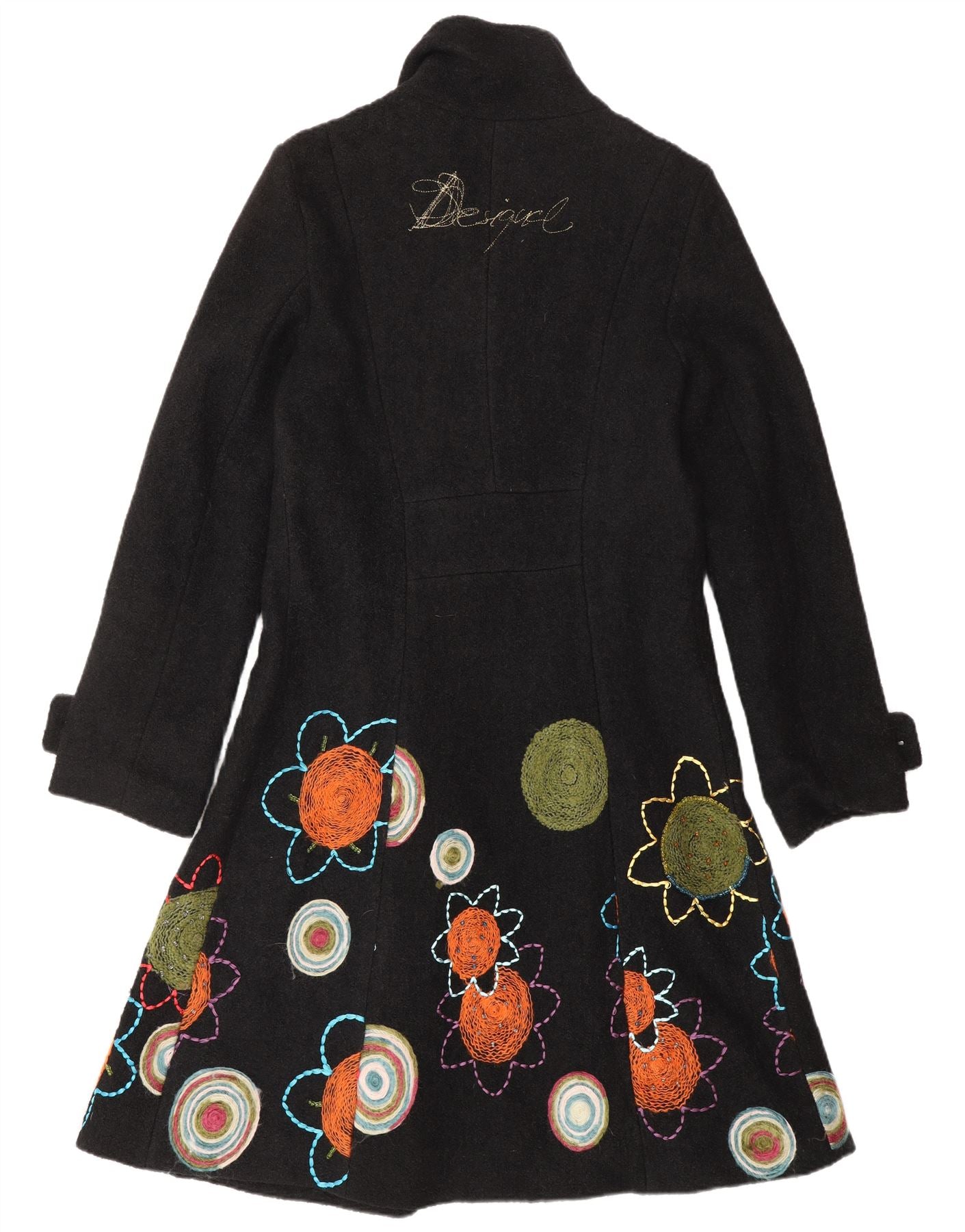 - Descriere AI: Această haină pentru femei Desigual este confecționată dintr-o țesătură neagră, oferind o potrivire obișnuită. Are un decolteu clasic cu guler și mâneci lungi cu manșete cu nasturi. Partea frontală este asigurată cu un rând de nasturi tonuri. Secțiunea inferioară a hainei este împodobită cu modele florale și circulare brodate vibrante, adăugând o notă boemă distinctivă. Este complet căptușită pentru confort și căldură. Spatele are brandul Desigual subtil.
