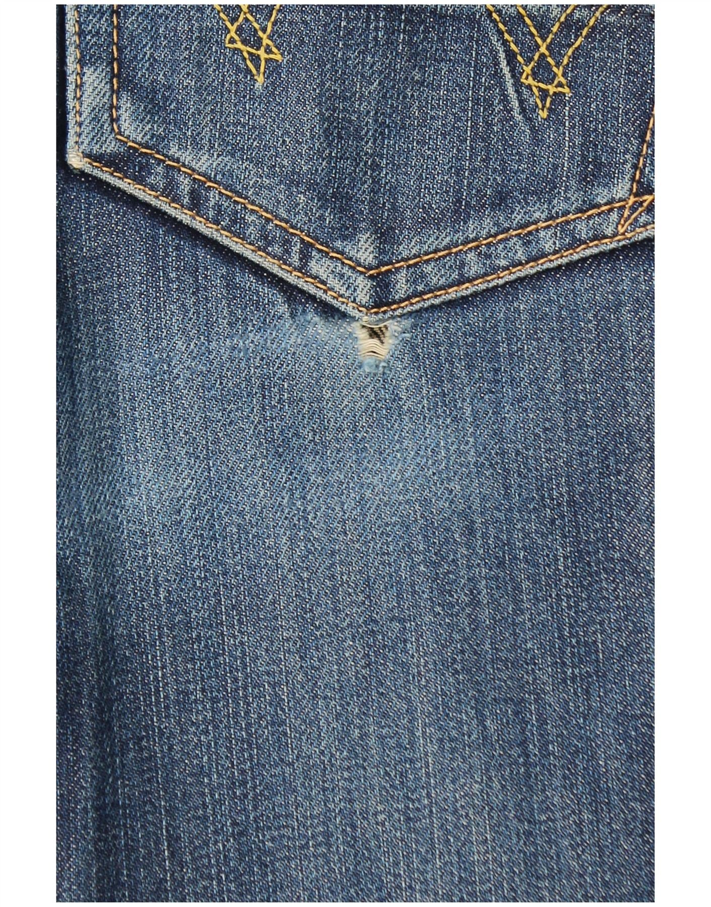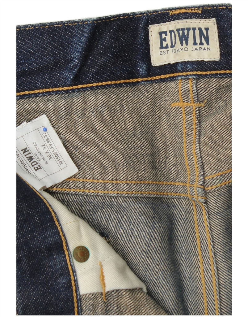 - AI Description: This Edwin mens slim jeans are crafted from blue denim, offering a subtly distressed texture. They feature a slim tapered fit, narrowing neatly towards the ankle. The classic button closure provides a secure fastening. Practical five-pocket styling is included. A discreet brand logo accents the design, ensuring a modern and versatile look.
