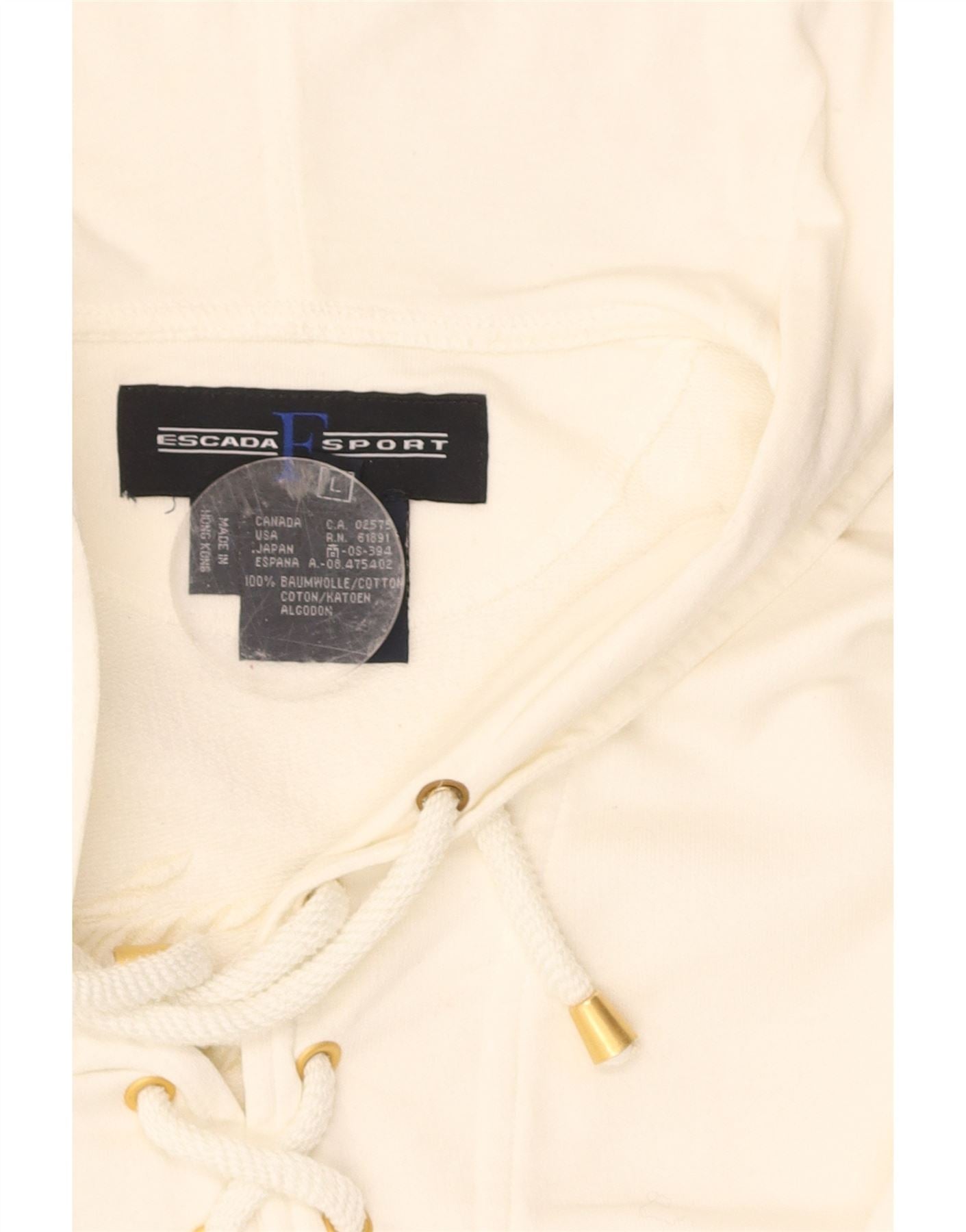 - AI Description: This Escada Sport womens hoodie jumper is crafted from soft off-white 100 percent cotton jersey. Its fleece lining offers exceptional comfort. It features a classic hooded design with long sleeves. The regular fit ensures a comfortable silhouette. A graphic design adds visual interest. The lace-up closure at the neckline provides an adjustable detail. Subtle embroidered accents complete the look.