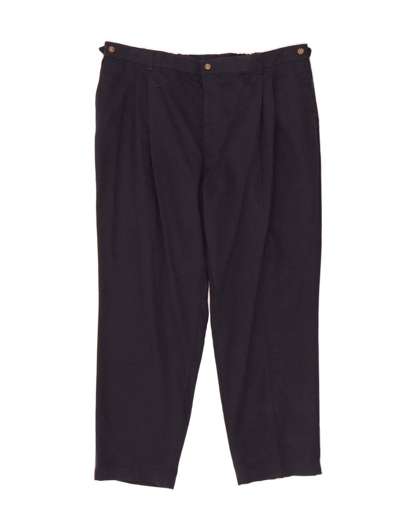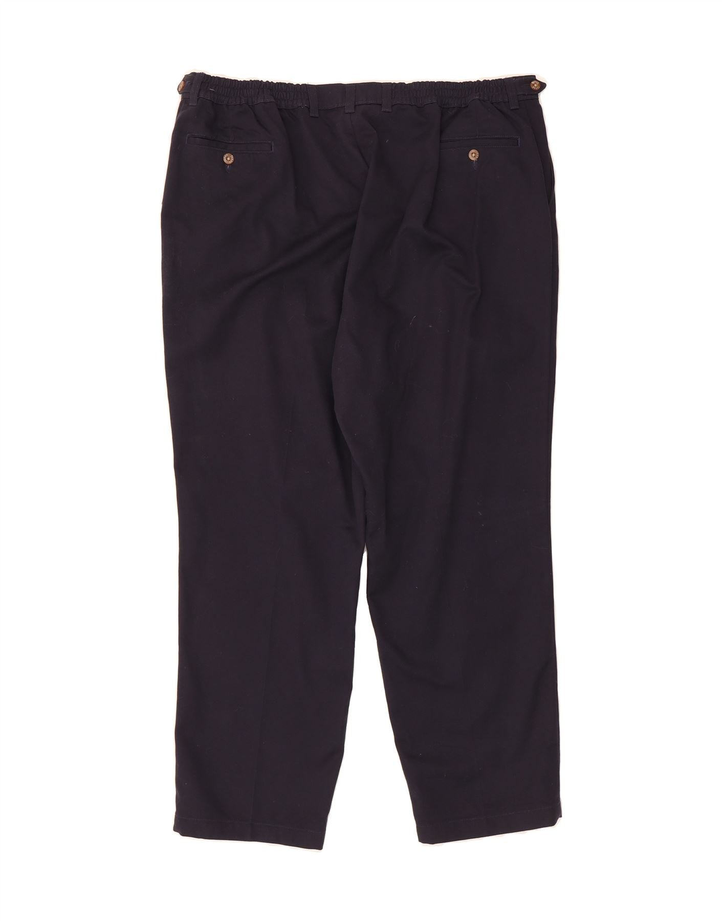 - AI Description: Elevate your wardrobe with these pre-owned Farah trousers, crafted from 100% cotton in a versatile navy blue. These classic-style trousers feature a regular fit, button closure, and woven fabric for lasting quality. Notable details include practical pockets, an adjustable elastic waist, and button accents. The design is subtly enhanced with accents. Size: 46W x 30L.