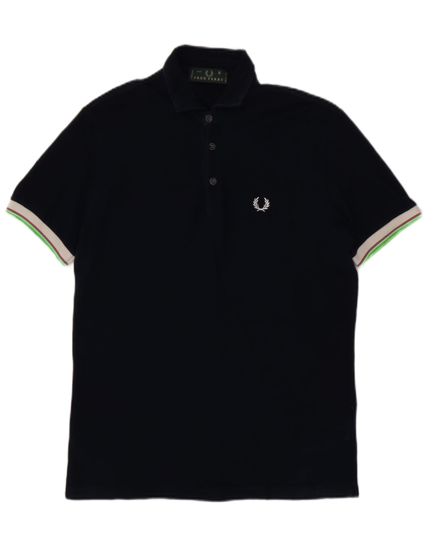- Descriere AI: Acest tricou polo Fred Perry pentru bărbați este confecționat din tricot moale de bumbac negru pentru confort. Are un decolteu clasic cu guler și o plăcuță cu nasturi. Mânecile scurte sunt finisate cu manșete cu dungi distinctive în alb și verde. Potrivirea regulată asigură o siluetă confortabilă și atemporală. Un logo brodat pe piept adaugă o notă de semnătură.