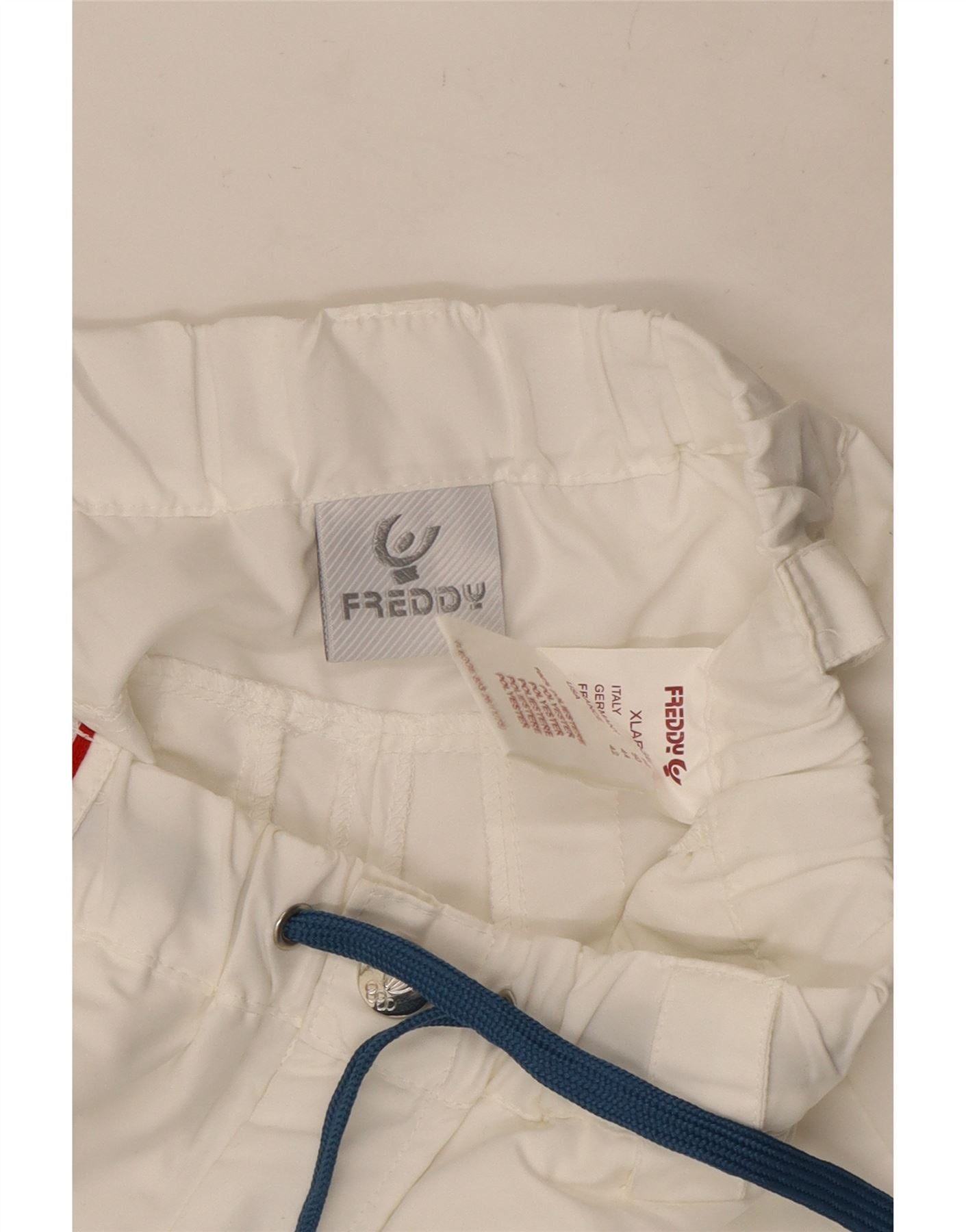- Descriere AI: Acești pantaloni de trening pentru femei Freddy sunt confecționați dintr-o țesătură albă clară, oferind un finisaj rezistent la vânt. Au o talie elastică confortabilă, cu închidere cu șnur albastru. Potrivirea obișnuită asigură o mișcare ușoară. Fermoarele gleznei permit un stil reglabil. Sunt incluse buzunare practice. Pantalonii sunt accentuați cu logo-ul Freddy și emblema echipei Italia Olympic, adăugând o notă sportivă.