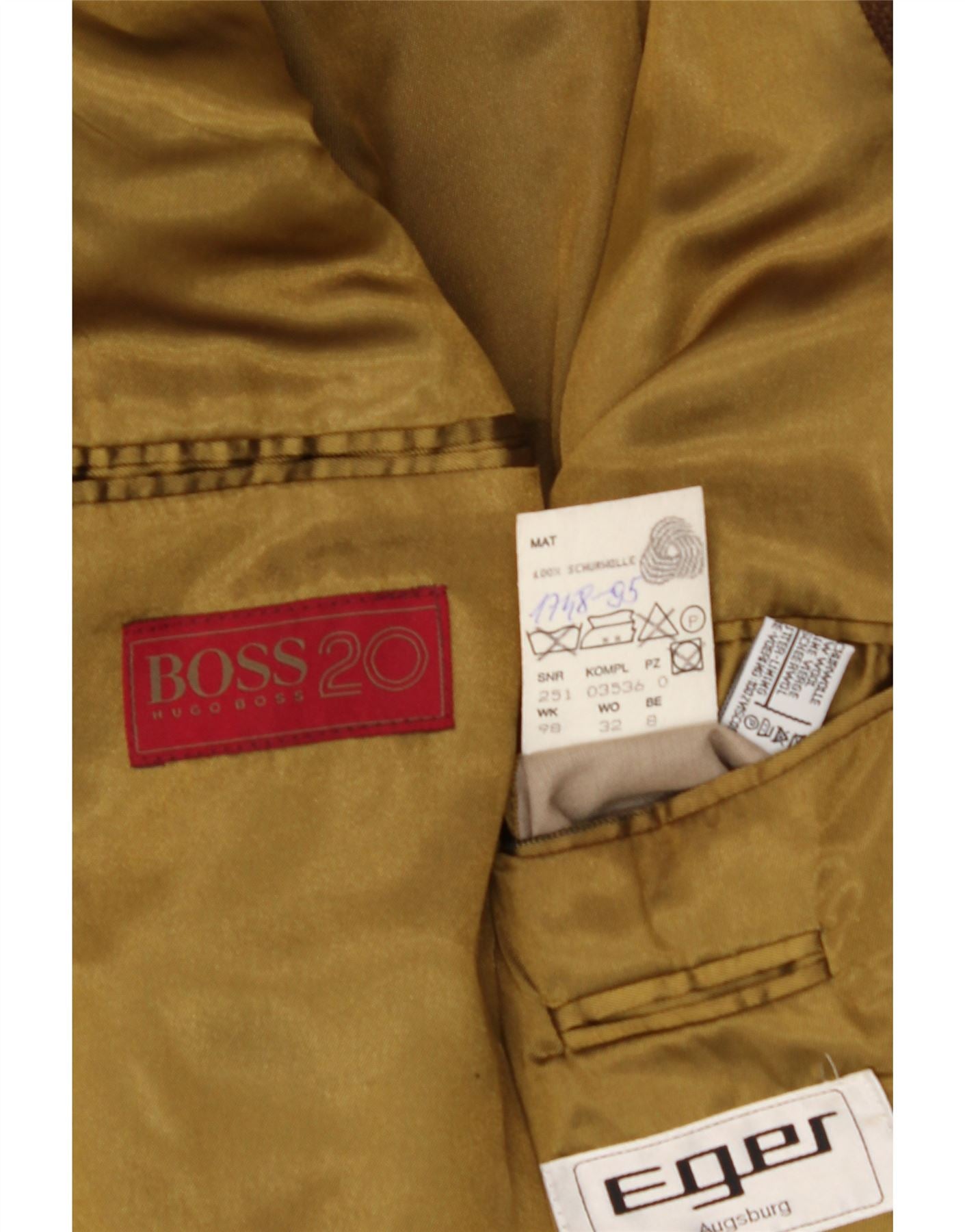 - AI Description: Hugo Boss men's blazer jacket in brown tweed wool. This pre-owned jacket is in excellent condition and features a classic style with a regular fit. The blazer is fully lined and includes shoulder pads and pockets. It fastens with buttons and has flecked pattern. Accented with buttons, the blazer also presents a logo. Recommended price of £40.