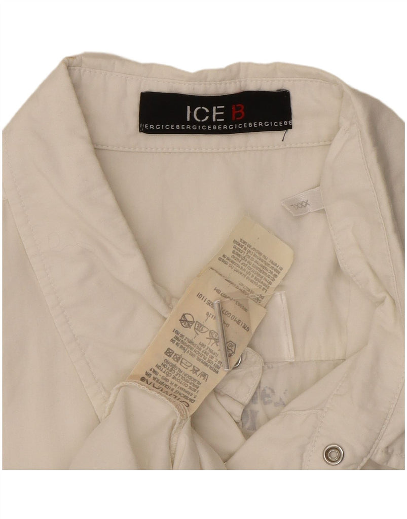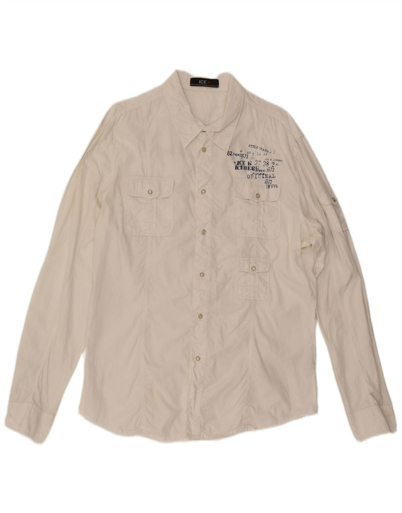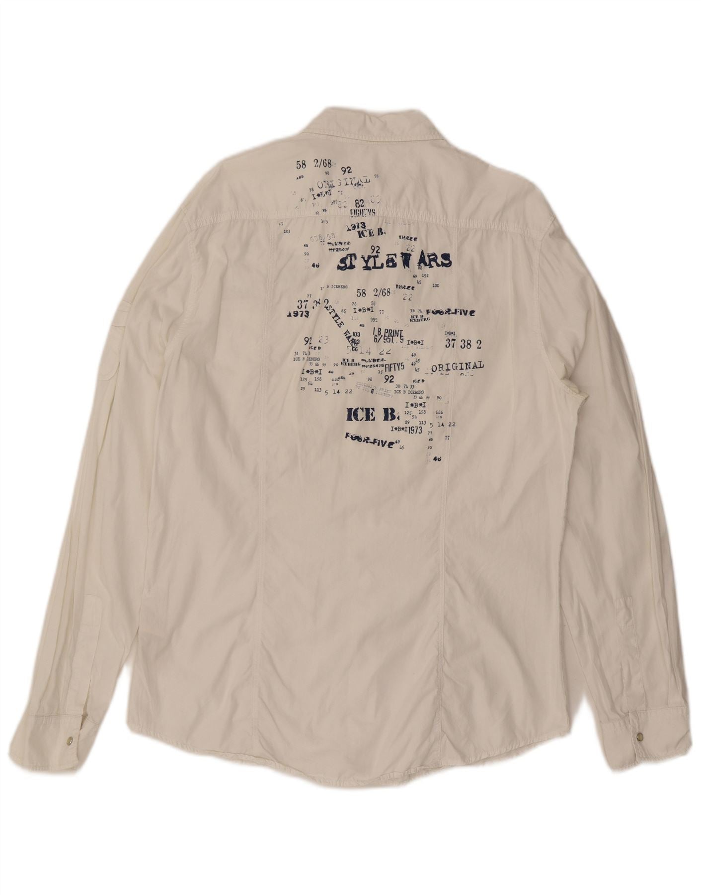 - AI Description: This Ice B mens shirt is crafted from 100 cotton woven fabric, offering a soft yet structured feel in a versatile off white hue. It features a classic collared neckline and long sleeves. The regular fit ensures comfortable wear. A button-up front and practical pockets add functional detail. An embroidered graphic accent provides a retro touch.