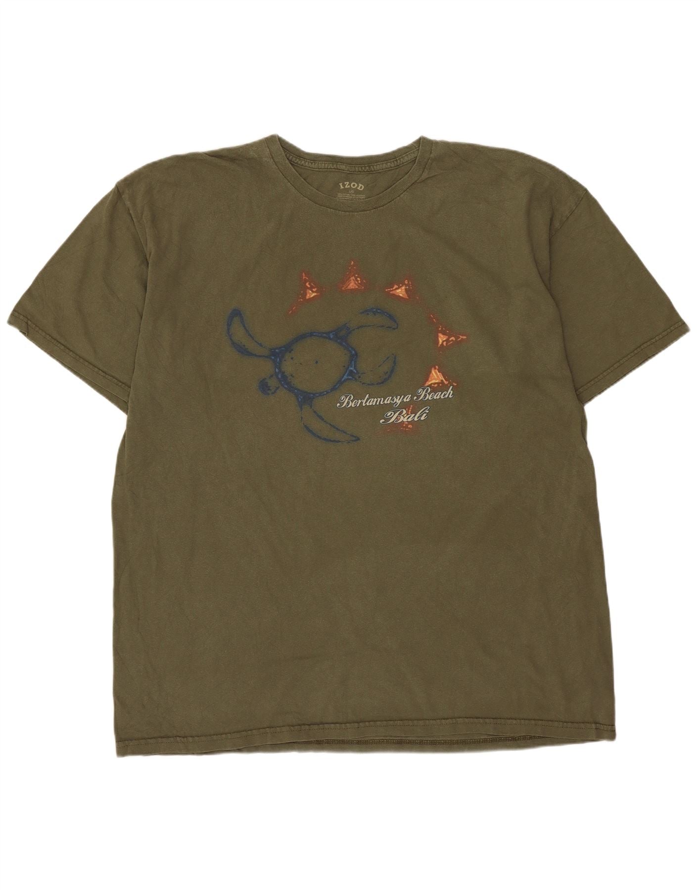 - Descriere AI: Acest tricou grafic Izod pentru bărbați este confecționat din jerseu moale de bumbac verde. Are un decolteu rotund clasic și mâneci scurte. Partea frontală afișează un grafic brodat al unei broaște țestoase cu textul Bertamasya Beach Bali. Acest pulover oferă o potrivire regulată confortabilă. Designul său în stil de plajă este perfect pentru ținute casual.