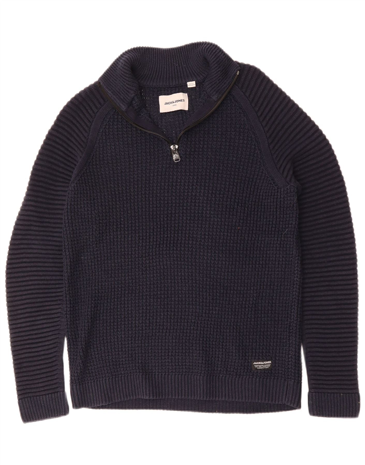 JACK & JONES Pulover pentru bărbați, cu fermoar, cu gât, bumbac mare, albastru bleumarin