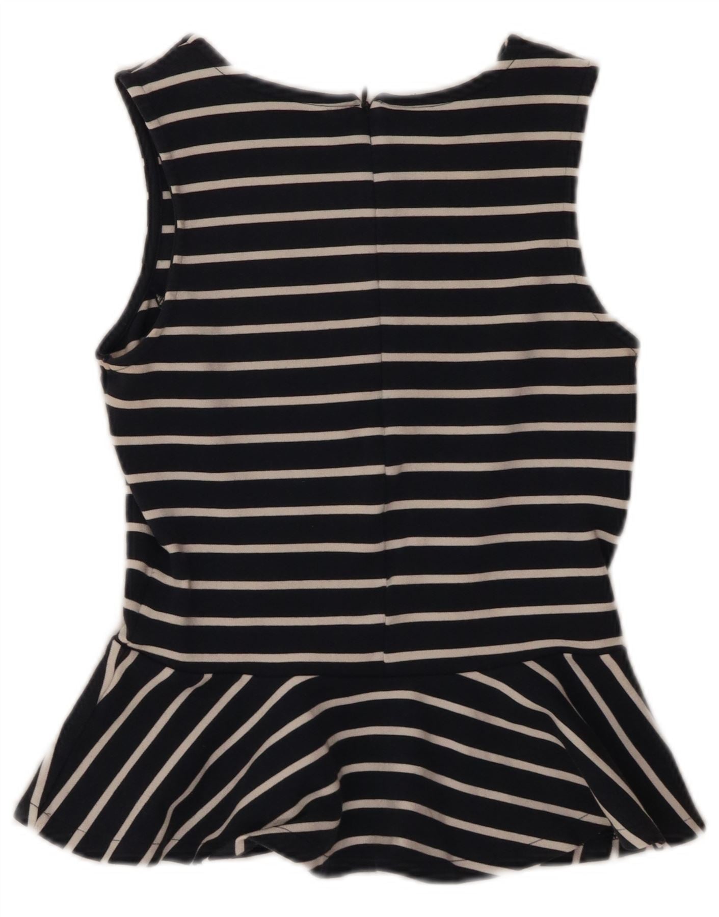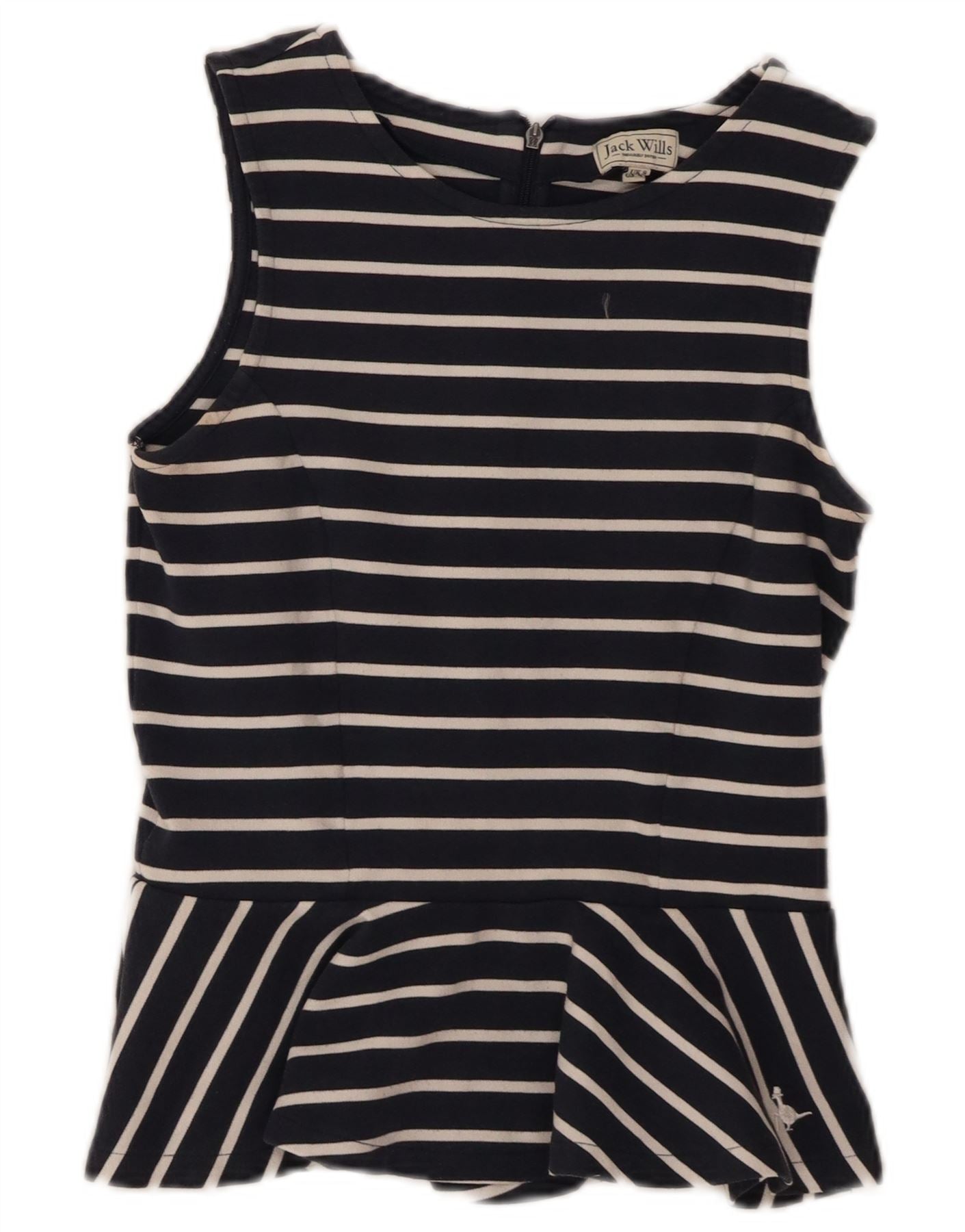 - Descriere AI: Acest top vest Jack Wills pentru femei este confecționat din țesătură moale de jerseu bleumarin. Are un model clasic cu dungi în alb. Designul fără mâneci și gâtul rotund oferă o siluetă curată. Un tiv peplum măgulitor adaugă un evantai elegant. Are o potrivire regulata si inchidere cu fermoar la spate. Un accent subtil de logo completează aspectul.