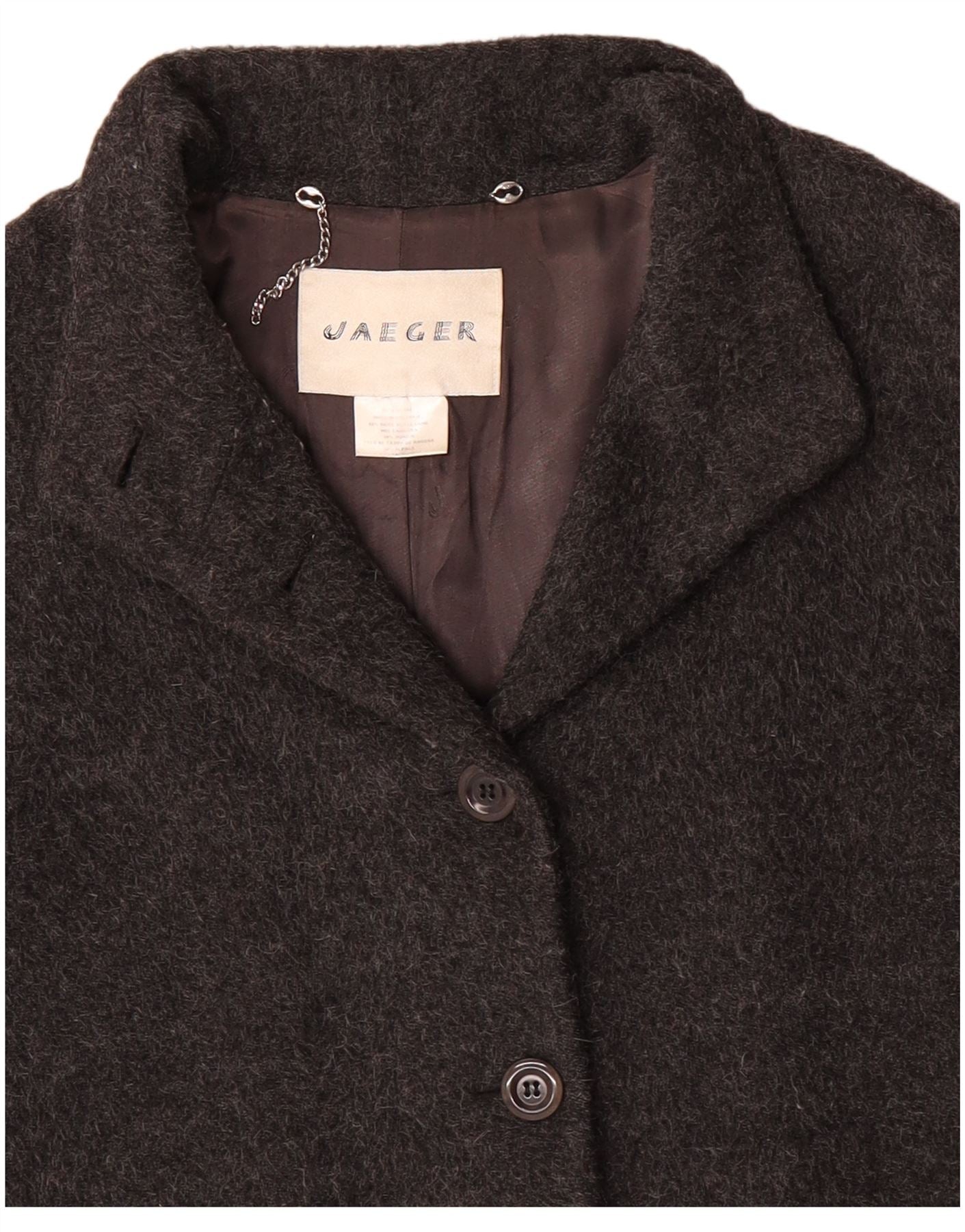- AI Description: This Jaeger womens coat is crafted from a premium grey woven wool, offering a refined texture. It features a classic collared neckline and a regular fit for timeless appeal. The 3/4 length sleeves provide a sophisticated silhouette. Button closures secure the front, complemented by practical pockets. This piece embodies classic style with elegant detailing.
