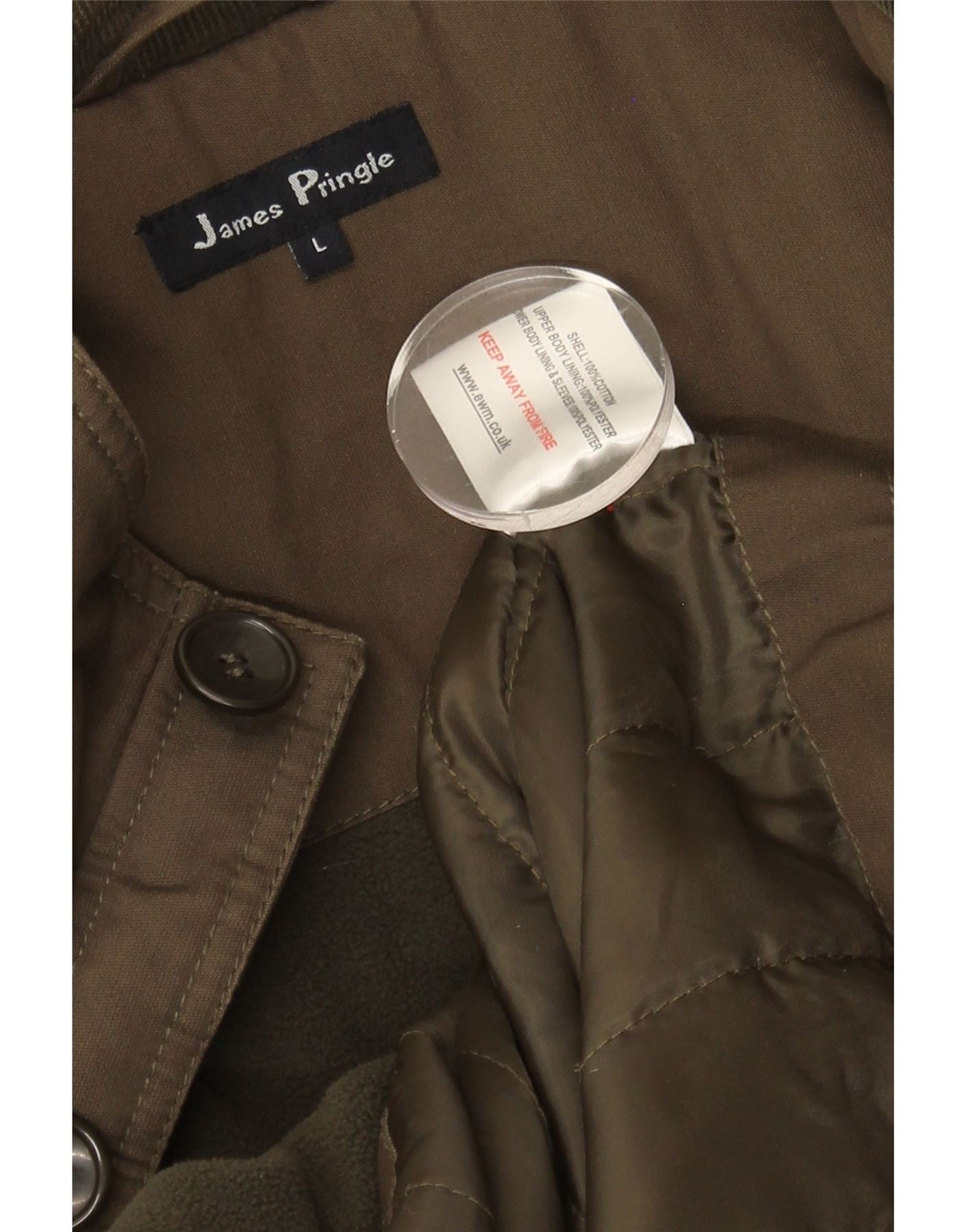 - AI Description: This James Pringle men's military jacket is crafted from robust khaki cotton. Its woven outer fabric offers a durable feel, while the padded lining ensures warmth. A classic collared neckline and long sleeves frame the design. It features a secure button closure and practical zip detail. Multiple pockets add utility. The regular fit balances structure with comfort, making it ideal for everyday wear.