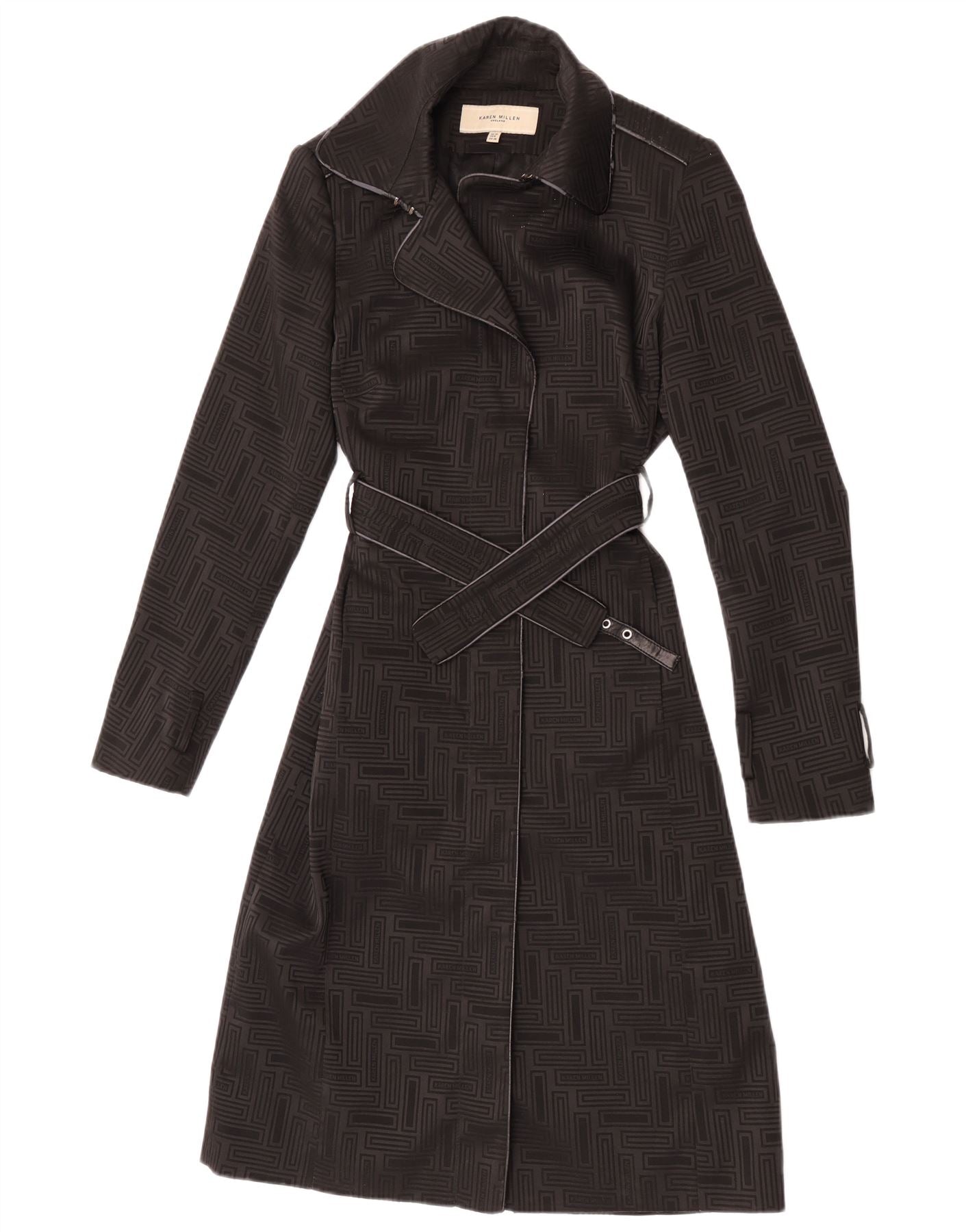 - Descriere AI: Acest trenci pentru femei Karen Millen este realizat din material jacquard negru, cu un model geometric subtil. Are un decolteu cu guler și mâneci lungi. O închidere completă cu fermoar fixează partea din față. Potrivirea obișnuită oferă o siluetă clasică. Include buzunare practice și este complet căptușită. O talie cu brâu, cu un accent de cataramă, se prinde pentru o formă măgulitoare, completând acest design sofisticat.