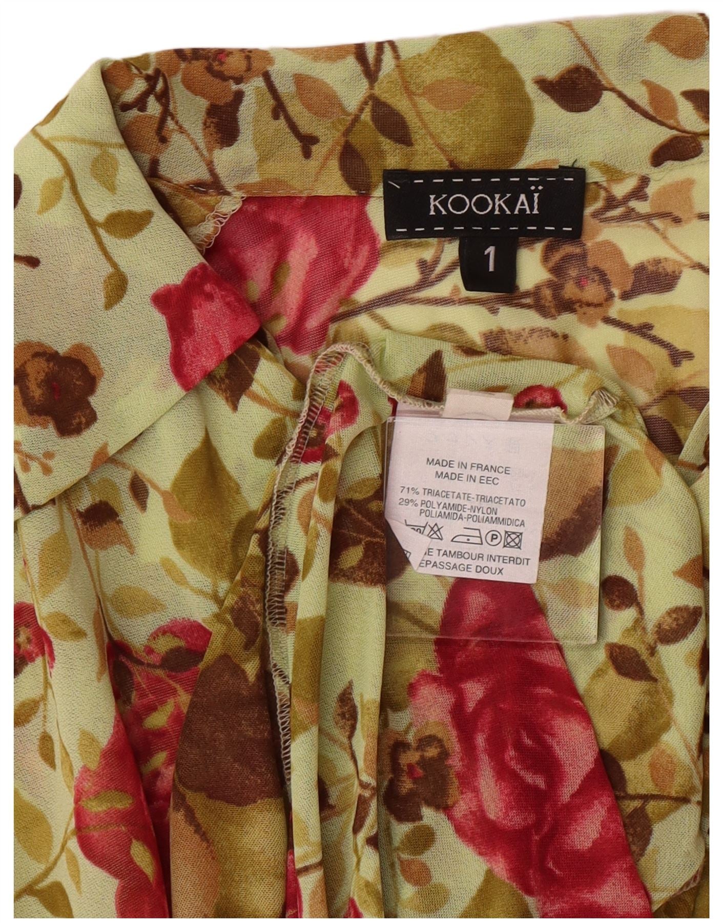 - Descriere AI: Această rochie cămașă pentru femei Kookai are un model floral verde pe țesătură din raion. Decolteul cu guler și închiderea cu nasturi adaugă o notă boemă. Mânecile lungi și o potrivire obișnuită oferă un stil fără efort. Căptușită pentru confort, această rochie, fabricată în Franța, combină designul clasic cu o estetică proaspătă, florală.