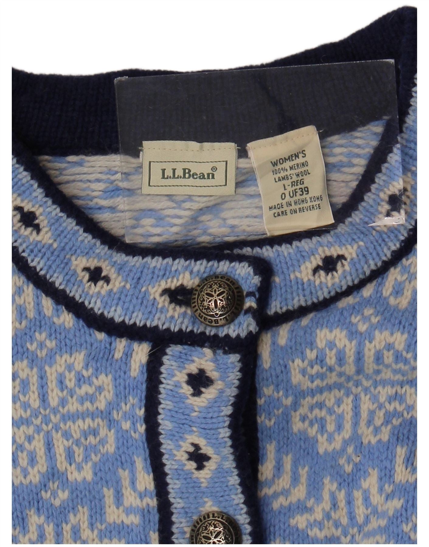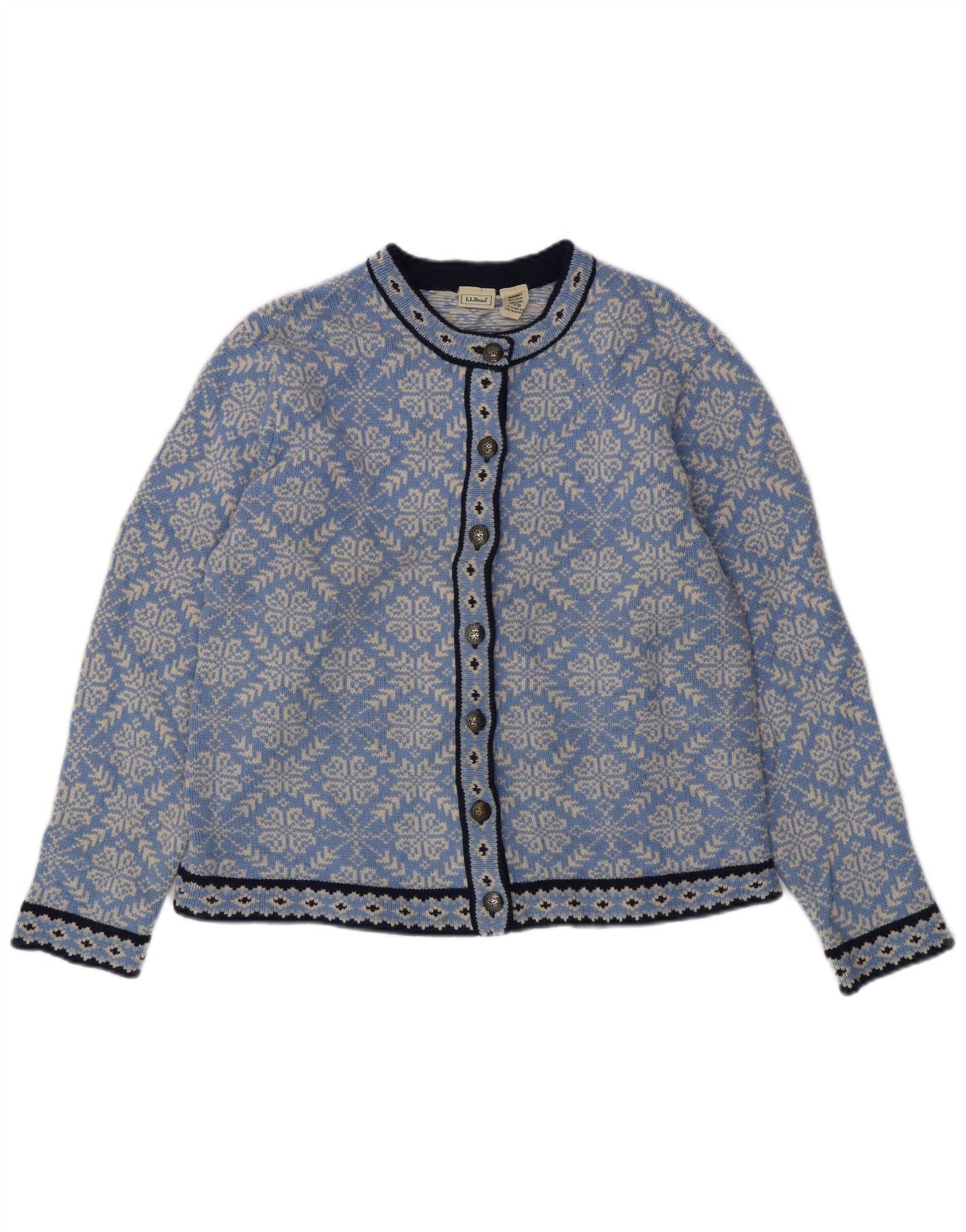 Pulover cardigan pentru femei L.L.BEAN UK 16 mare, albastru, lână merinos Fair Isle