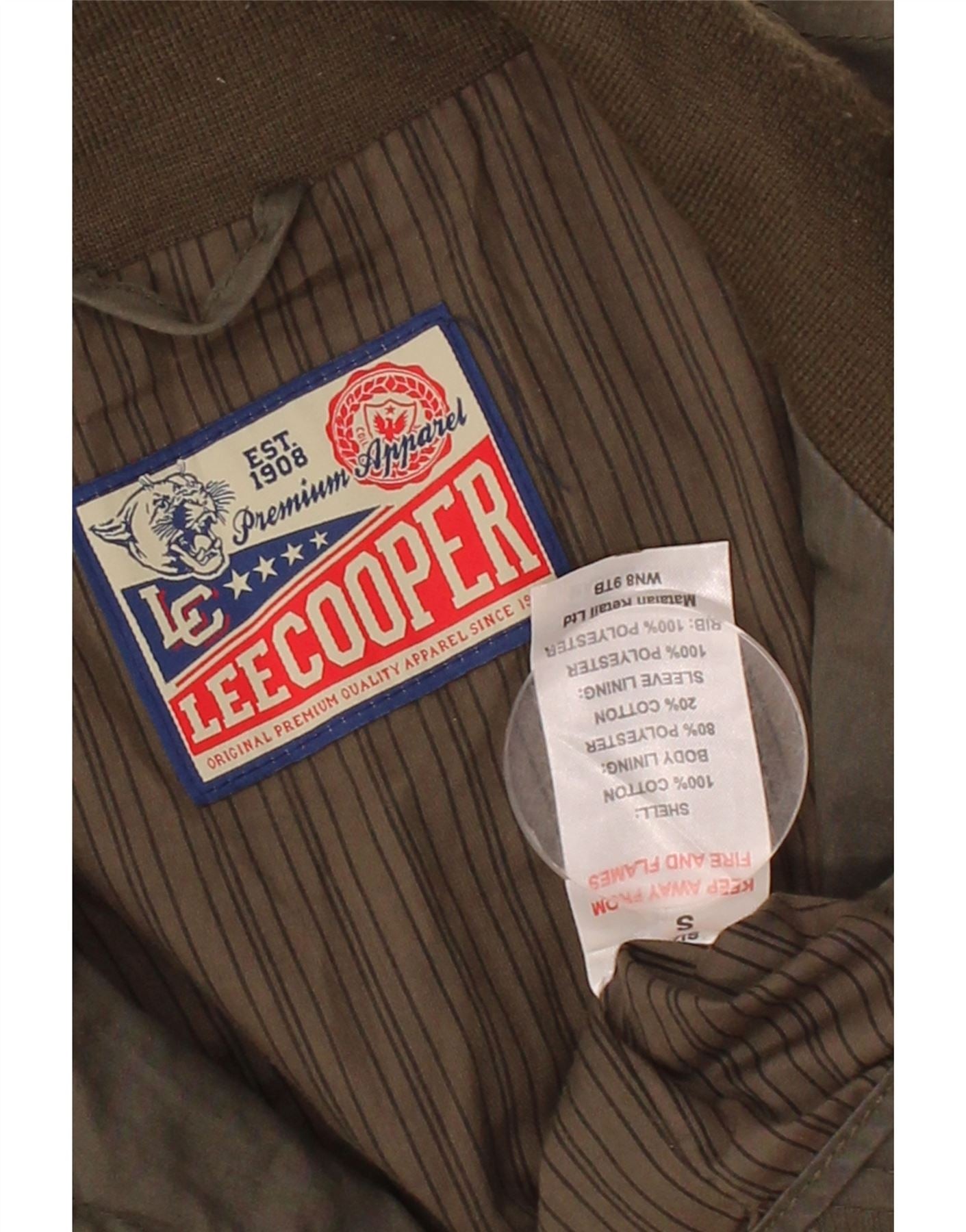 - AI Description: This pre-owned Lee Cooper military jacket is in excellent condition. Crafted from 100% cotton, it features a woven fabric and a regular military fit. The jacket comes in a versatile green hue, with a collared neckline and long sleeves. Design details include a full zip closure, button accents, and multiple pockets. The body lining is 80% polyester 20% cotton, with 100% polyester sleeve lining and ribbing. Label size S. Washing Instructions: KEEP AWAY FROM FIRE AND FLAMES.