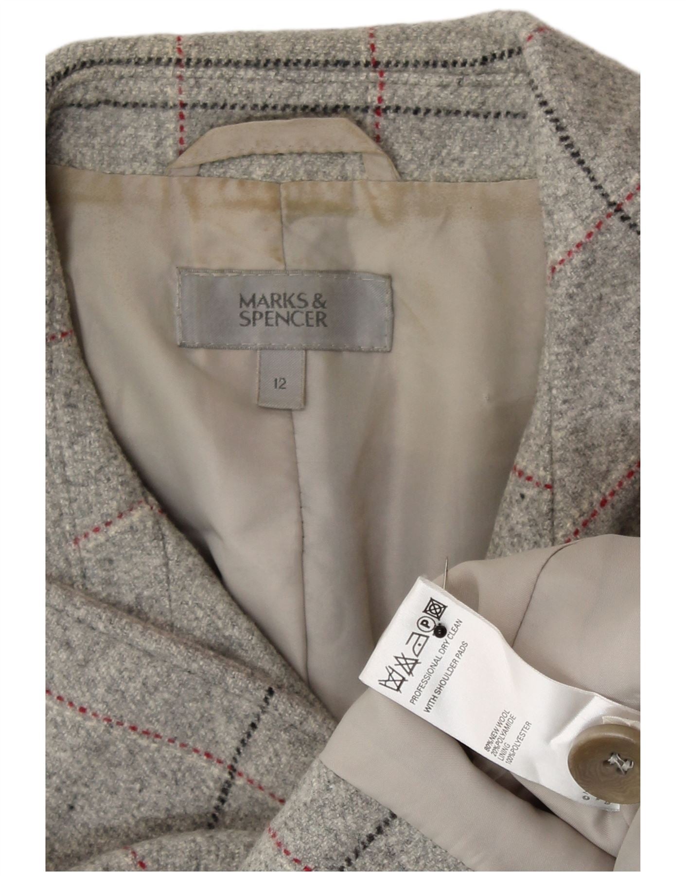 - Descriere AI: Această jachetă pentru femei Marks & Spencer este confecționată dintr-un tweed gri din amestec de lână nouă. Are un model clasic de carouri cu linii roșii subtile. Partea frontală cu piept dublu se închide cu patru nasturi. Un decolteu cu guler și mânecile lungi îi definesc structura. Pernițele pentru umeri și căptușeala completă asigură o potrivire regulată pe măsură. Această piesă oferă un stil sofisticat atemporal.