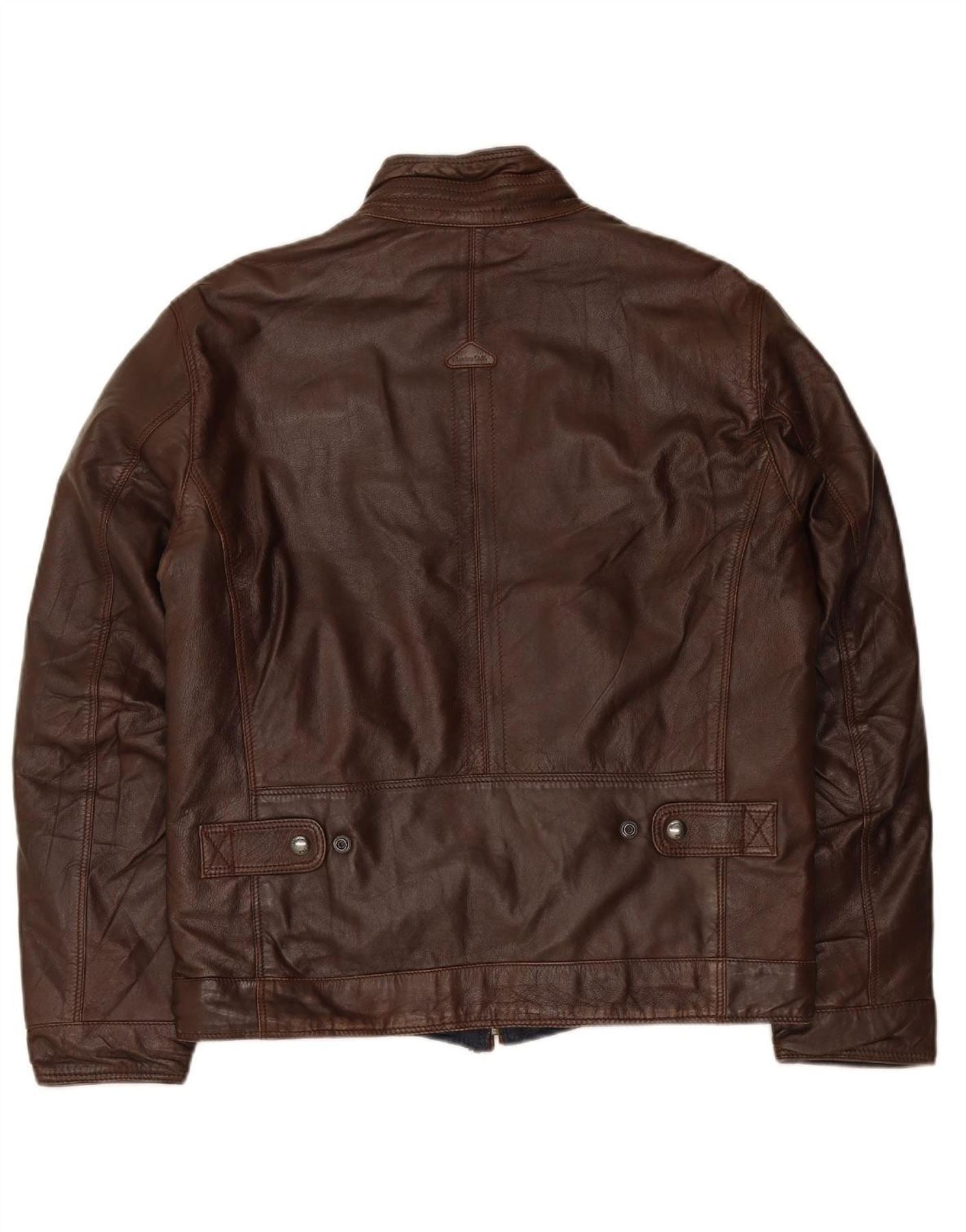 - AI Condition: Pre-owned | grade: Moderate | location: Overall on the brown leather exterior, including front, back, and sleeves, showing creasing and scuffing consistent with use. | type: Visible wear