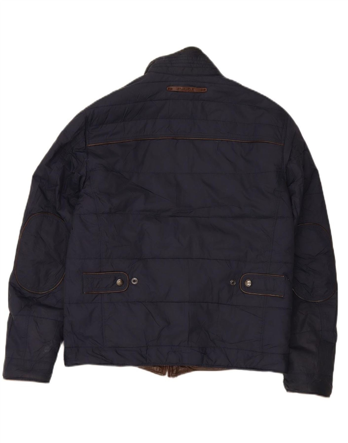 - AI Description: This Massimo Dutti mens reversible jacket is crafted from rich leather, offering a smooth finish on one side. It features a classic collared neckline and long sleeves. The full zip closure provides a clean, modern look. Being reversible, it offers versatile styling with a different material on the other side. Functional pockets add practicality. The regular fit ensures comfort and ease of movement for a modern style.