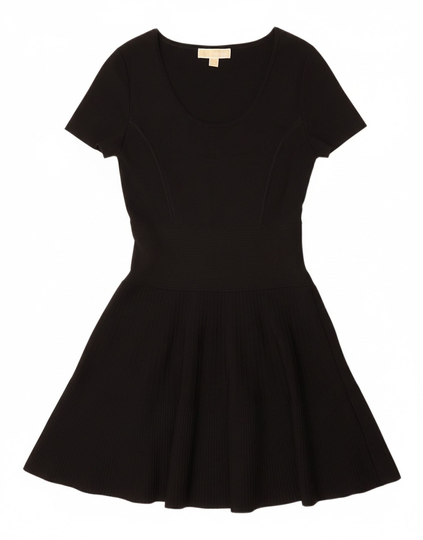 - Descriere AI: Această rochie leagăn pentru femei Michael Kors este realizată cu experiență dintr-un amestec moale de tricot negru din raion. Țesătura oferă elasticitate confortabilă pentru o mișcare ușoară. Are un decolteu rotund clasic și mâneci scurte. Această rochie pulover asigură o purtare fără efort. Potrivirea sa obișnuită creează o draperie măgulitoare și relaxată, completată de detalii subtile cu logo-ul.