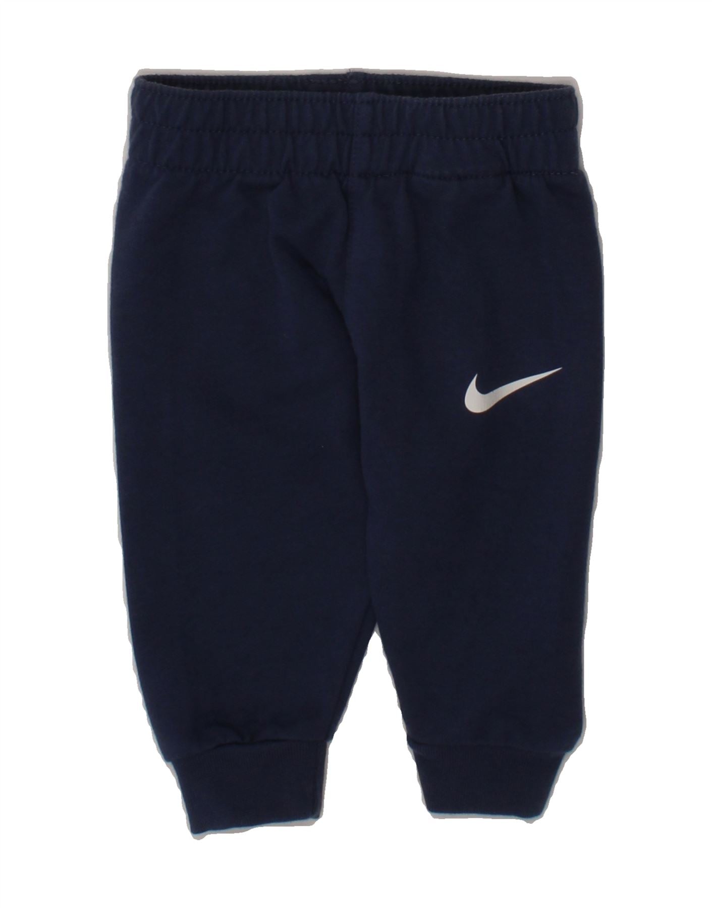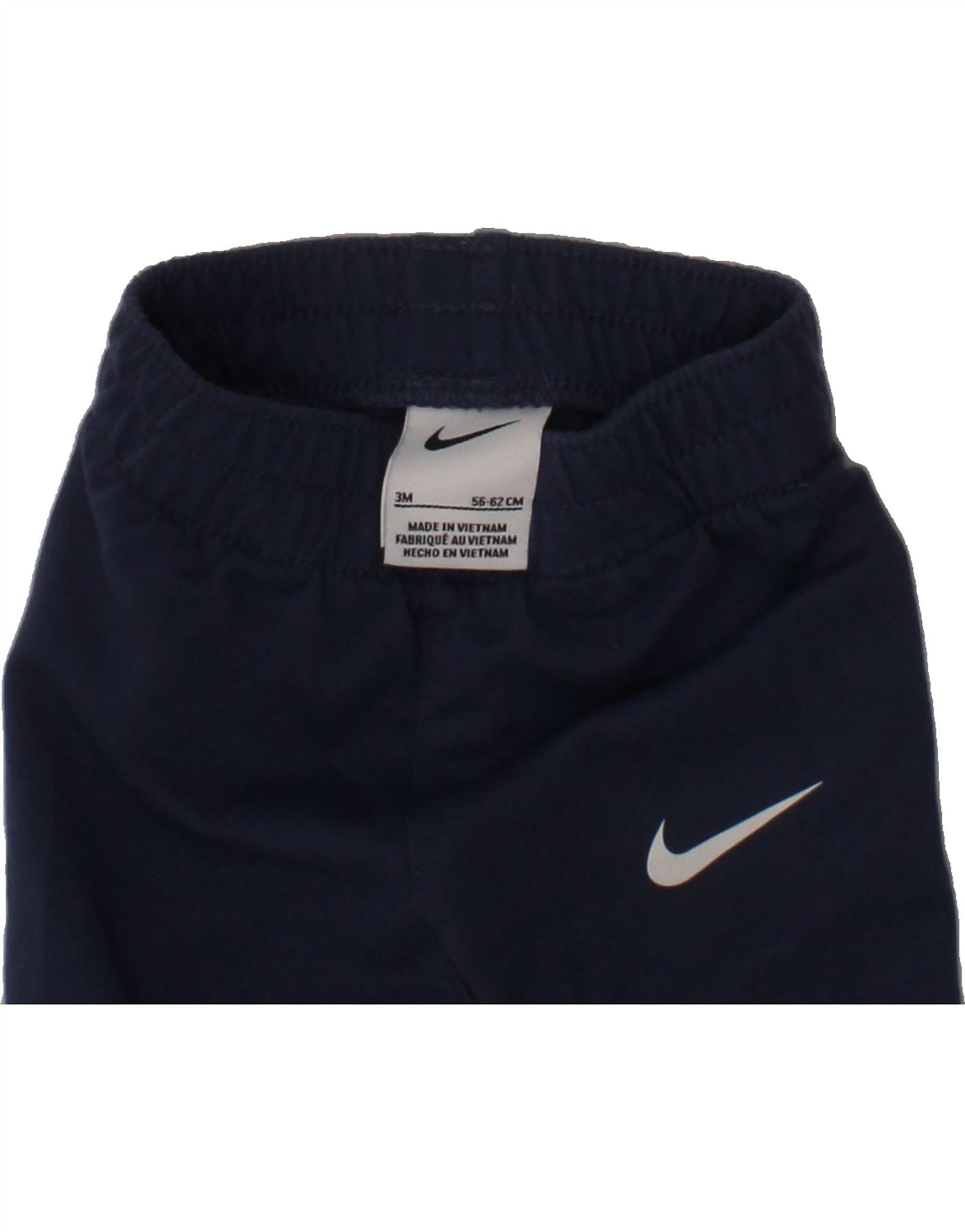 - AI Description: These pre-owned Nike tracksuit trousers for baby boys are in excellent condition, perfect for sporty little ones. The navy blue knit trousers feature a regular fit, elastic waist for easy pull-on, and a logo accent. Size 3M. Note minor loose stitching on the waistband. Made in Vietnam.
