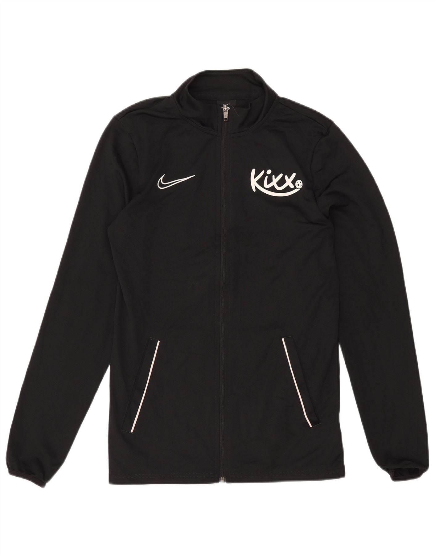 - Descriere AI: Această jachetă de trening pentru bărbați Nike este confecționată din jerseu ușor de poliester negru. Are un gât înalt și o închidere completă cu fermoar. Mânecile lungi oferă o acoperire largă. Potrivirea regulată asigură o mișcare confortabilă. Un swoosh alb Nike și logo Kixx împodobesc partea din față. Spatele afișează un grafic teamOrange. Sunt incluse buzunare practice. Acest top Dri-Fit este ideal pentru antrenamentul de fotbal.