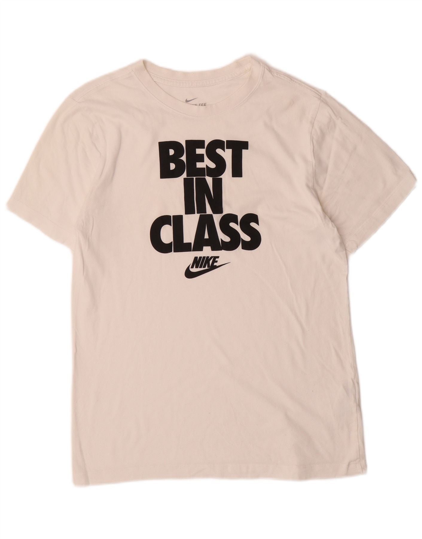 - Descriere AI: Acest tricou grafic pentru bărbați Nike este confecționat din jerseu moale de bumbac alb. Are un gât rotund clasic și mâneci scurte. Potrivirea obișnuită asigură confort și ușurință în mișcare. Un imprimeu grafic BEST IN CLASS îndrăzneț împodobește partea din față, alături de emblematica logo Nike. Acest stil de pulover oferă un aspect curat, contemporan.