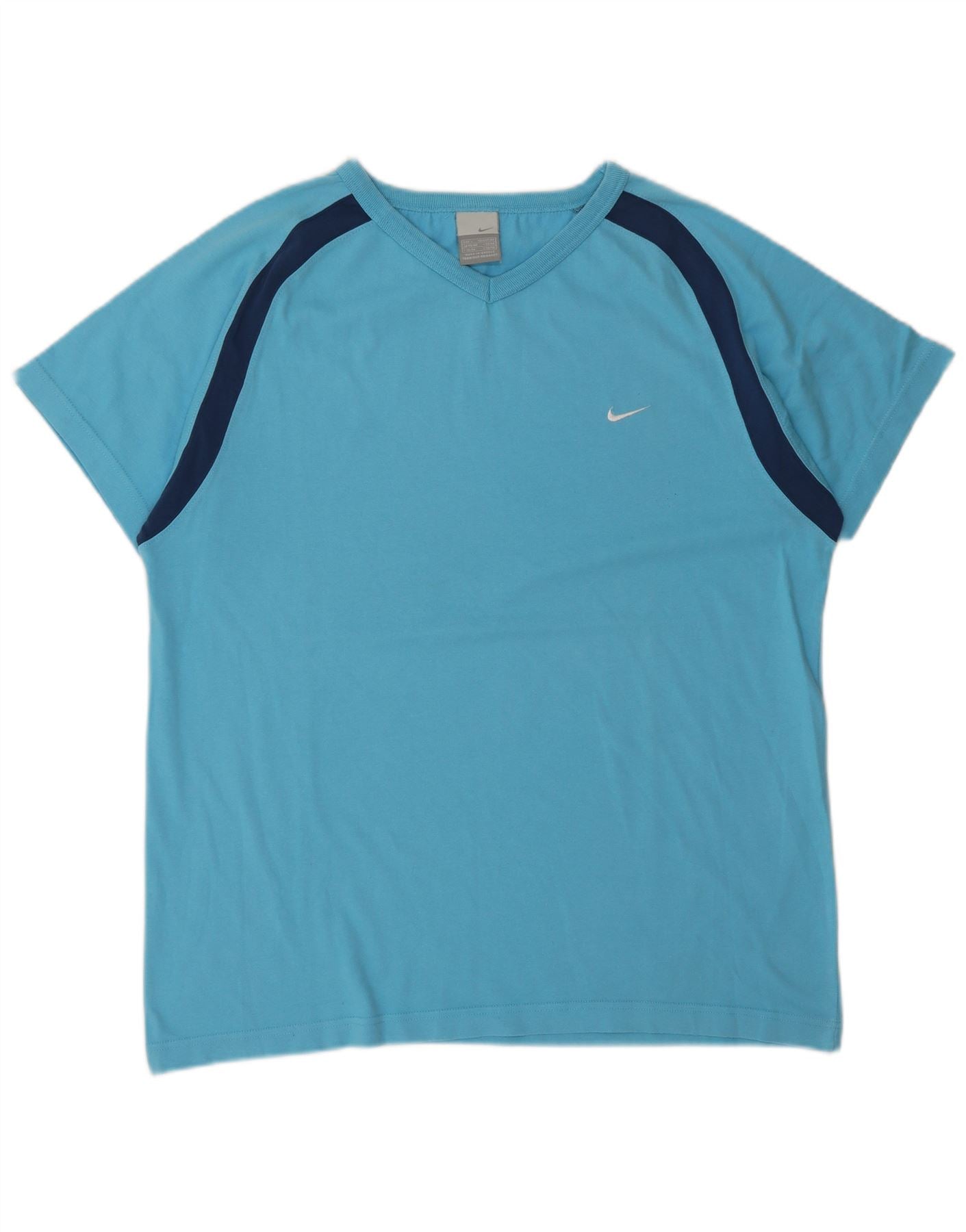 - Descriere AI: Acest tricou pentru bărbați Nike este confecționat din țesătură de jerseu Nike Dri-Fit albastru. Are un decolteu clasic în V și mâneci scurte. Potrivirea obișnuită asigură confort și ușurință în mișcare. Panourile albastru închis accentuează umerii, adăugând un contrast sportiv. Un logo Nike subtil este pozitionat pe piept. Acest stil de pulover este ideal pentru ținute sport sau casual.