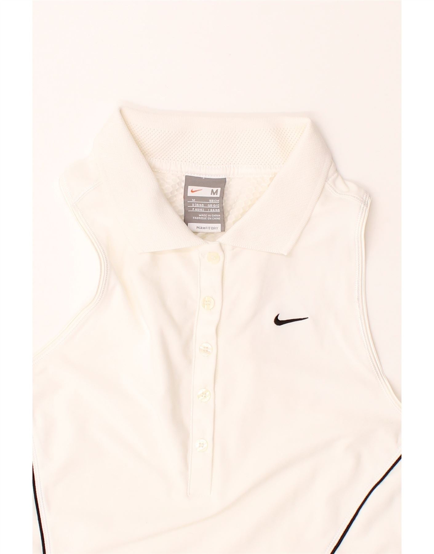 - AI Description: This pre-owned Nike women's sleeveless polo shirt in white combines style and performance. Crafted from 100% polyester with Nike's Dri-FIT technology, it offers excellent moisture-wicking and breathability. The slim, regular fit ensures a flattering silhouette, complemented by a classic collared neckline and button closure. Lightweight and designed for sports, it features subtle branding and minor staining near the front lower right side. Machine washable for easy care, this versatile top is perfect for activewear or casual wear.