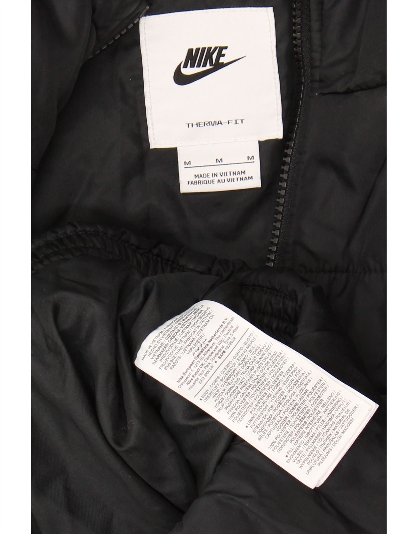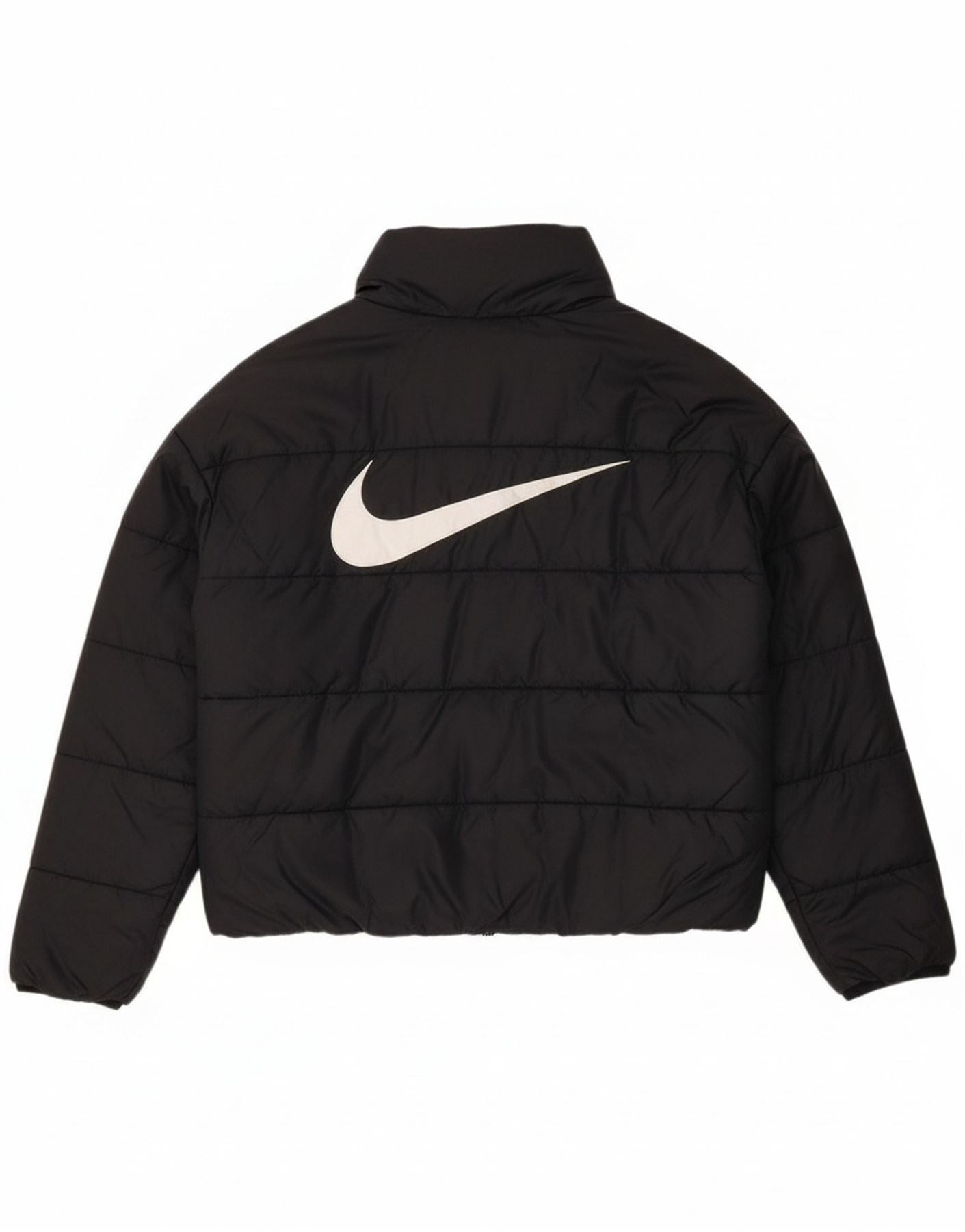 - AI Description: This Nike women's padded jacket is crafted from 100 percent polyester with a sleek woven finish. Its black thermal design offers lightweight warmth and a regular fit. The collared neckline leads to a full zip closure for easy wear. A practical hood and useful pockets enhance functionality. Long sleeves complete the comfortable athletic silhouette. A subtle logo accent adds signature branding.