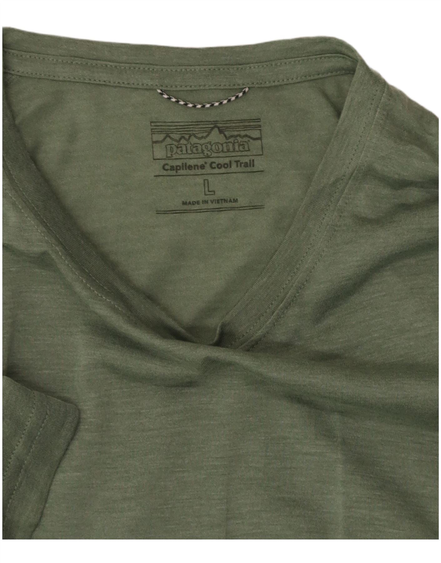 - AI Description: This Patagonia mens T-shirt is crafted from Capilene Cool Trail jersey, offering a lightweight and breathable feel. It features a classic round neck and short sleeves. The pullover design ensures ease of wear. A regular fit provides comfortable movement. Designed for performance, this top is ideal for sports activities, keeping you cool and dry.