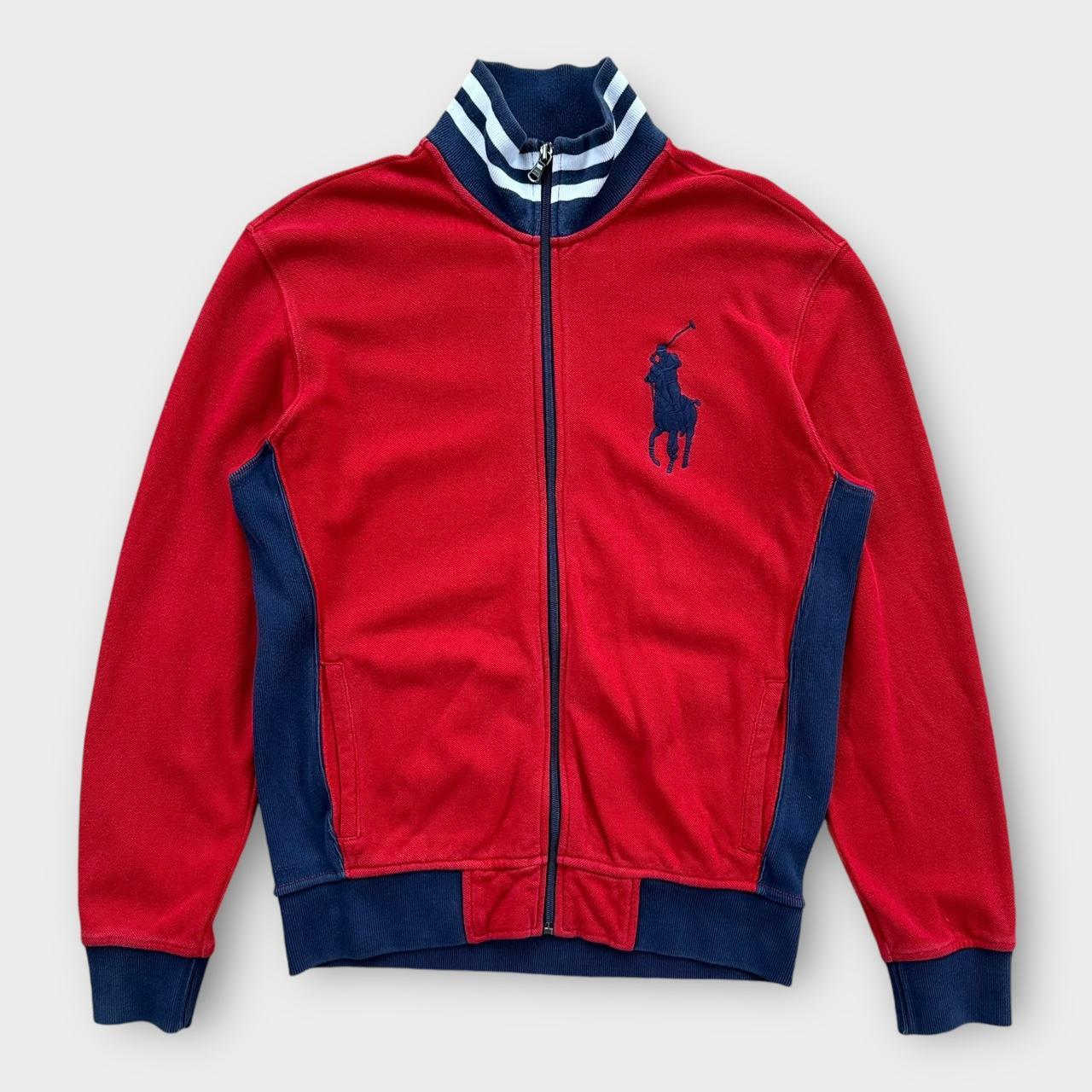 Jachetă Polo Ralph Lauren cu fermoar, roșu și bleumarin de la începutul anilor 2000, cu logo mare de ponei brodat pe piept
