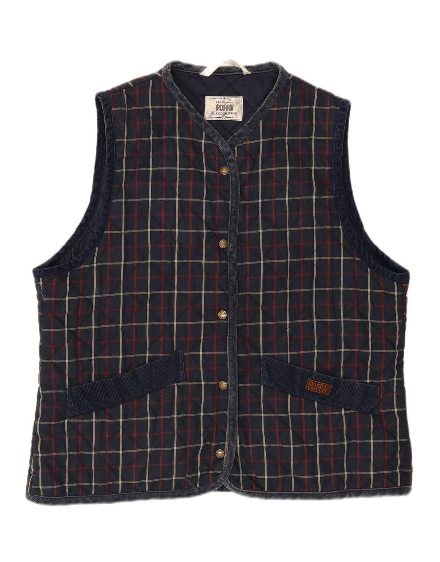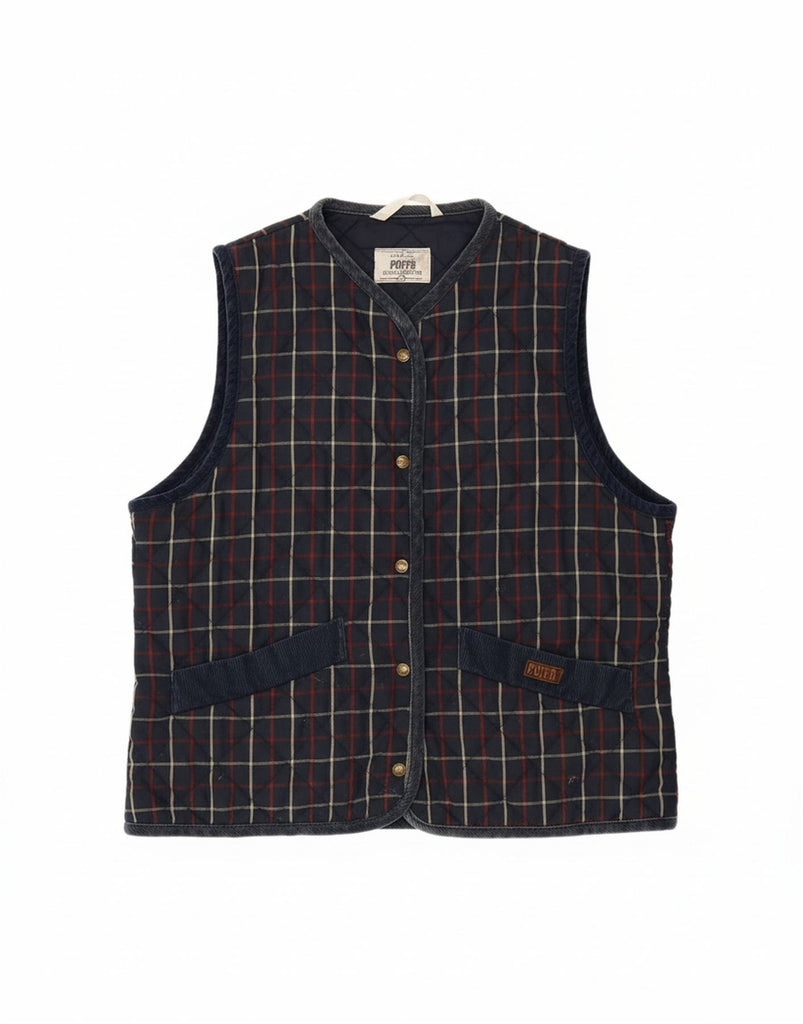 - AI Description: This Puffa womens waistcoat is presented in a deep navy blue blended fabric, featuring a distinguished plaid pattern. Its classic collared, sleeveless design offers a traditional silhouette. A five button front closure secures the regular fit, ensuring comfort. The waistcoat boasts a full lining and includes practical pockets for convenience. An adjustable waist allows for a tailored shape, completing this versatile and timeless piece. A subtle brand logo adds a refined touch.