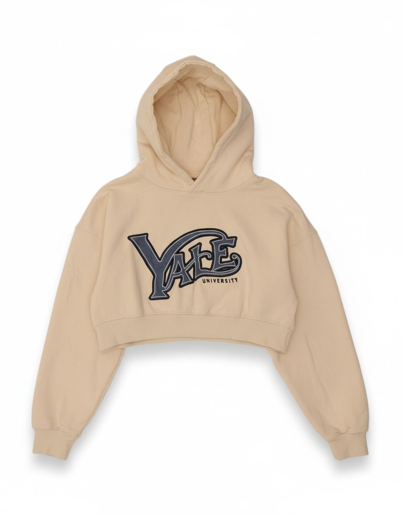 - AI Description: This Pull & Bear women's hoodie jumper is crafted from soft off-white knit fabric, offering a comfortable feel. It features a relaxed, cropped fit with long sleeves and a cosy hooded design. The pullover style ensures effortless wear. A distinctive Yale University graphic and logo adorn the front, adding a stylish university-inspired touch.