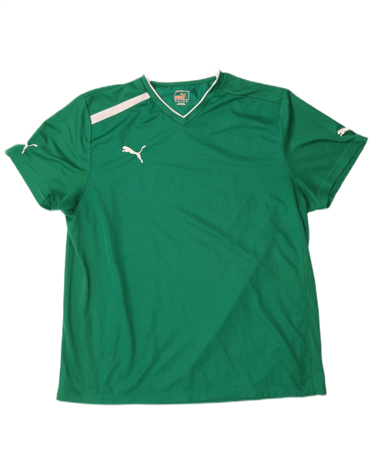 - Descriere AI: Acest top din tricot pentru bărbați Puma este confecționat din țesătură de plasă verde respirabilă. Plasa sa ușoară și elastică oferă confort pentru purtarea activă. Are un decolteu clasic în V și mâneci scurte. Potrivirea obișnuită asigură o mișcare ușoară. Detaliile cu dungi albe împodobesc umerii și părțile laterale. Un logo Puma proeminent este afișat pe piept și mâneci. Acest design de pulover este ideal pentru fotbal și combină stilul sportiv cu performanța.