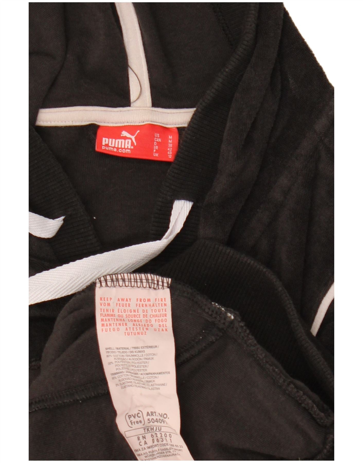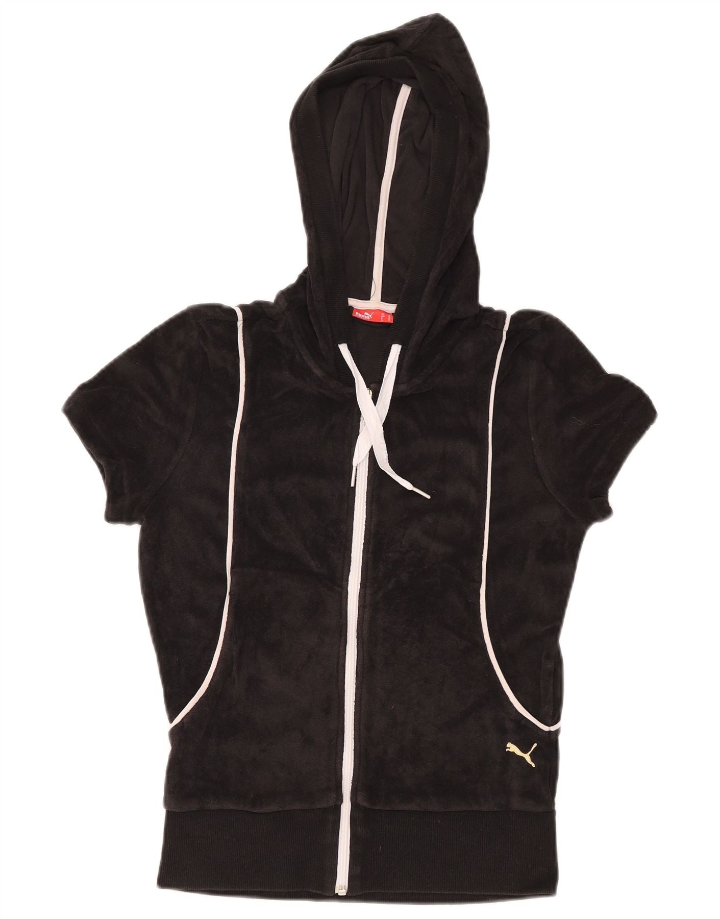 Pulover PUMA pentru femei cu mânecă scurtă din catifea cu fermoar și cu capotă UK 12 Medium Negru