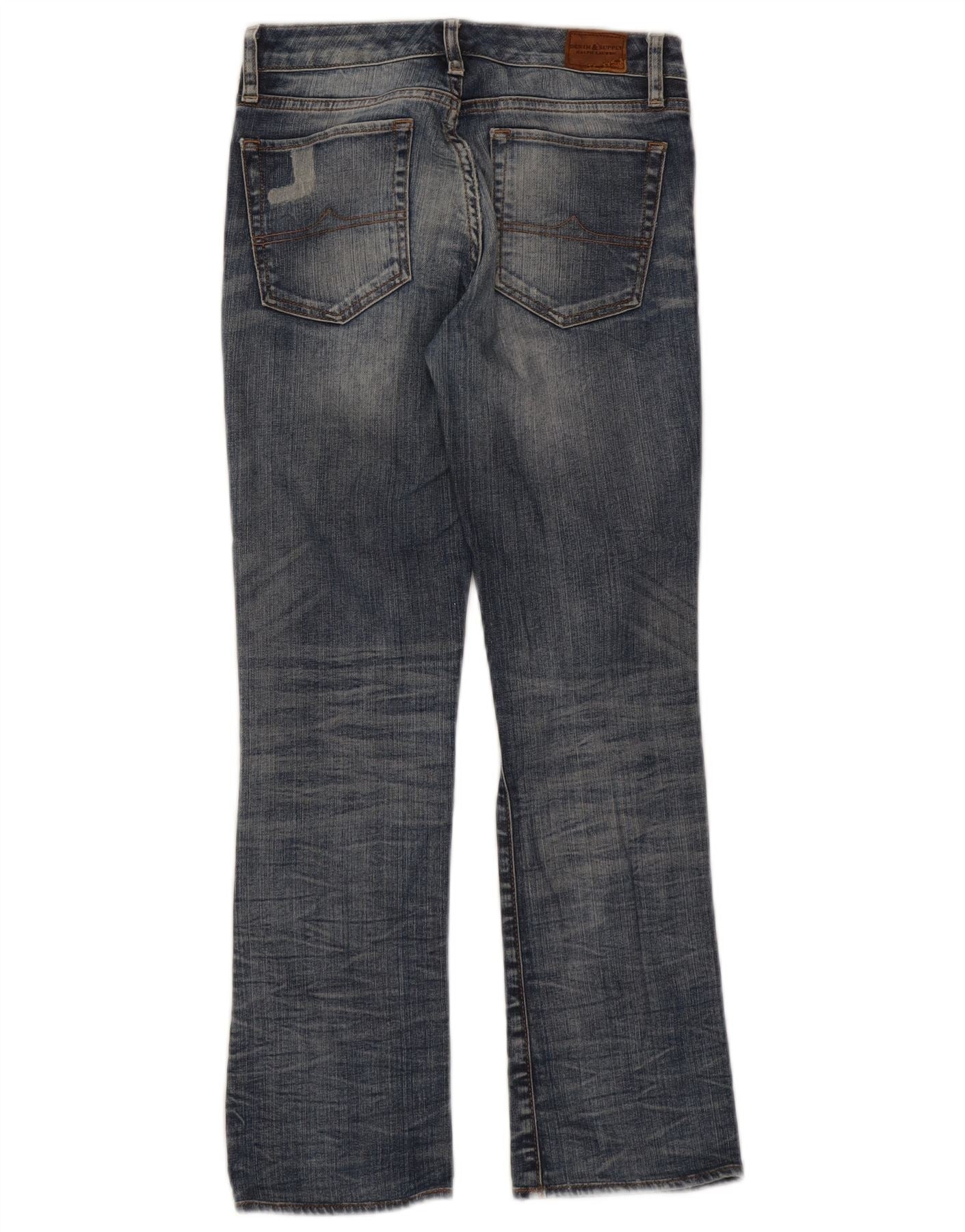 - AI Description: These Ralph Lauren womens bootcut jeans are crafted from blue cotton denim with a comfortable stretch. They feature a mid-rise waist and a classic button closure. The regular fit offers ease, while the bootcut leg flares gently. Distressed detailing adds a contemporary edge. Practical pockets and a subtle logo accent complete the design.